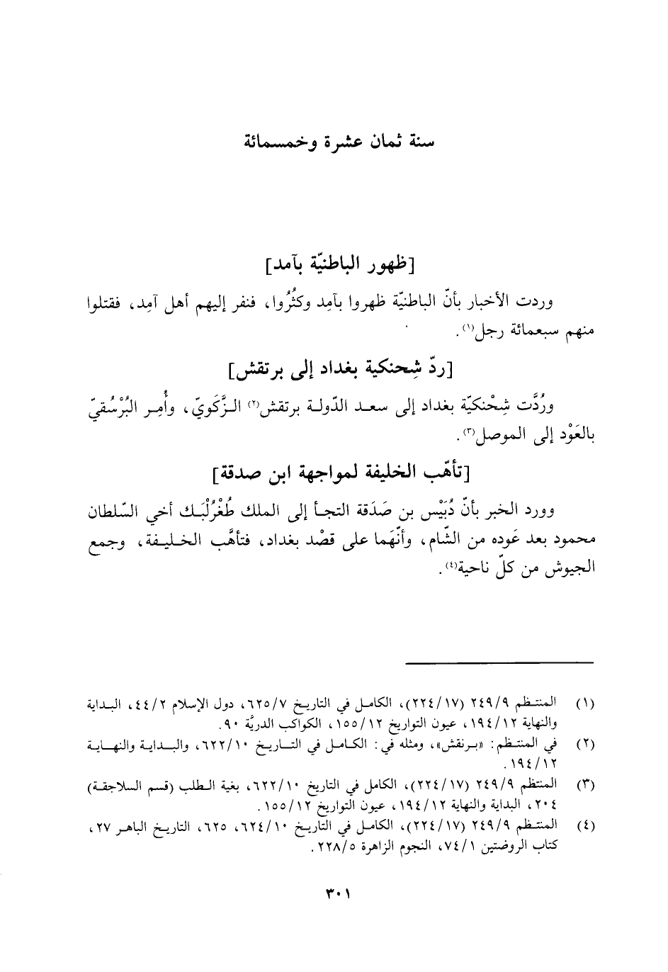 [4] المنتظم 9/ 249 (17/ 224) ، الكامل في التاريخ 10/ 624، 625، التاريخ الباهر 27، كتاب الروضتين 1/ 74، النجوم الزاهرة 5/ 228.