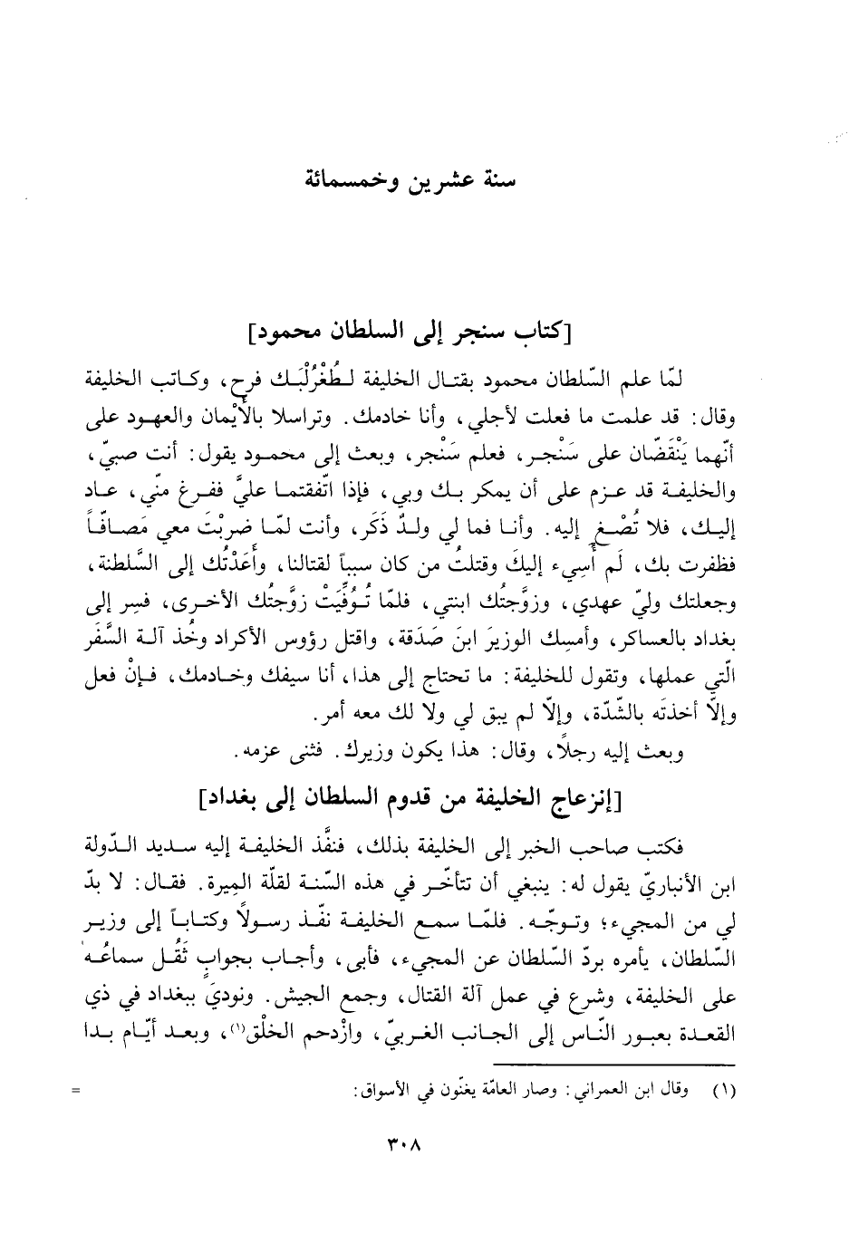 فكتب صاحب الخبر إلى الخليفة بذلك، فنفَّذ الخليفة إِليْهِ سديد الدّولة ابن الأنباريّ يقول له: ينبغي أن تتأخّر في هذه السّنة لقلّة المِيرة. فقال: لَا بدّ لي مِن المجيء: وتوجّه. فلمّا سَمِعَ الخليفة نفّذ رسولًا وكتابًا إلى وزير السّلطان، يأمره بردّ السّلطان عَنِ المجيء، فأبي، وأجاب بجوابٍ ثَقُل سماعُه عَلَى الخليفة، وشرع في عمل آلة القتال، وجمع الجيش. ونوديَ ببغداد في ذي القِعْدة بعبور النّاس إلى الجانب الغربيّ، وازدحم الخلق [1] ، وبعد أيّام بدا