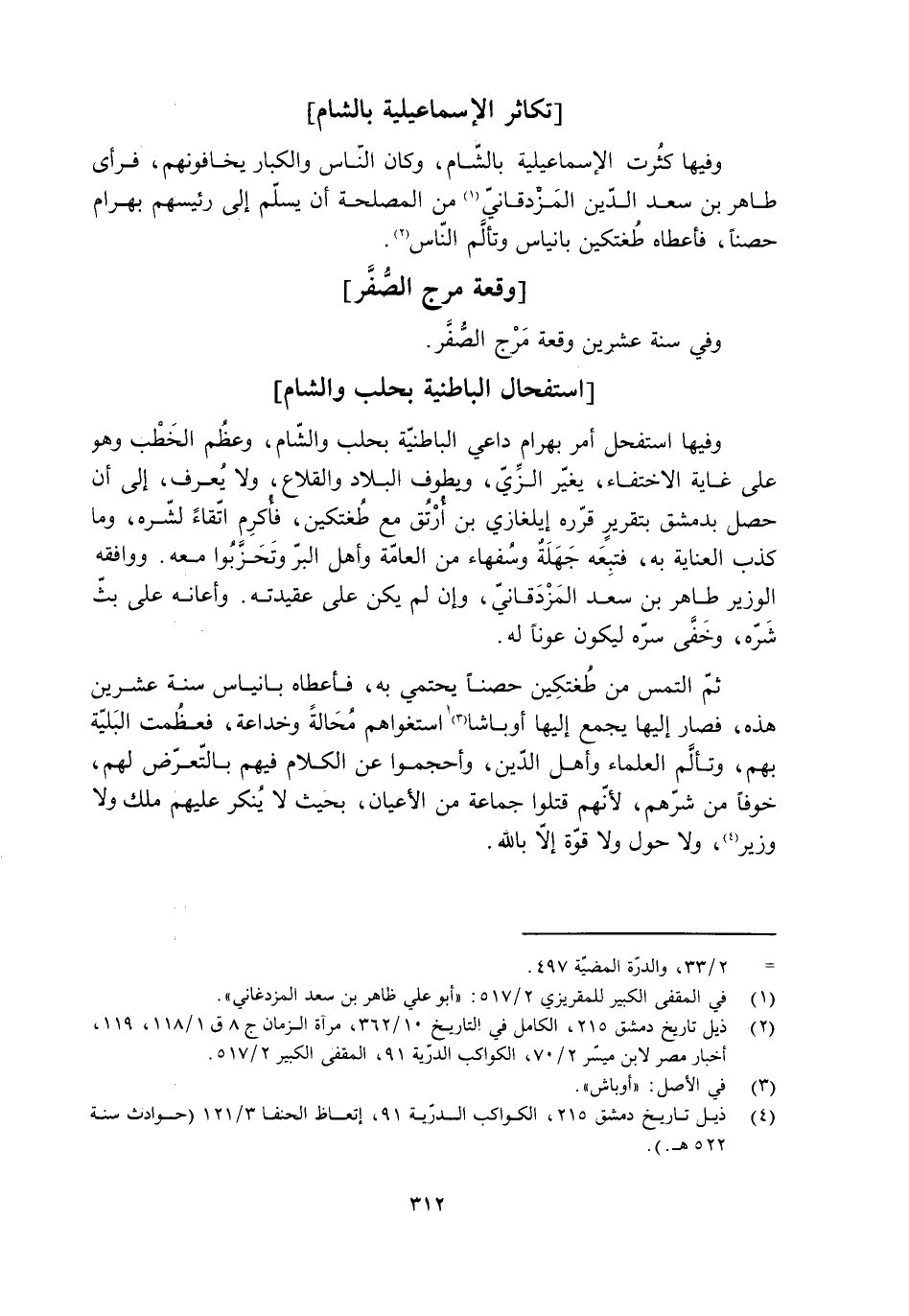 وفيها كثُرت الإسماعيلية بالشام، وكان النّاس والكبار يخافونهم، فرأى طاهر بْن سَعْد الدّين المَزْدقانيّ [1] مِن المصلحة أن يسلّم إلى رئيسهم بهرام حصنًا، فأعطاه طُغتِكين بانياس وتألَّم النّاس [2] .