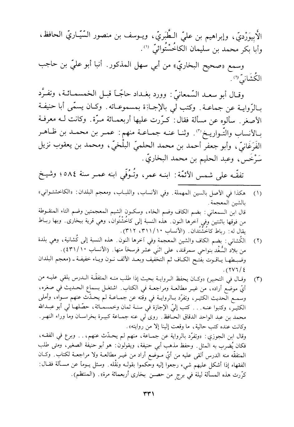 وقال أبو سَعْد السّمعانيّ: وورد بغداد حاجّا قبل الخمسمائة، وتفرَّد بالرّواية عَنْ جماعة. وكتب لي بالإجازة بمسموعاته. وكان يسمّى أبا حنيفة الأصغر. سألوه عن مسألة فقال: كرّرت عليها أربعمائة مرّة. وكانت لَهُ معرفة بالأنساب والتّواريخ [3] . وثنا عَنْهُ جماعة منهم: عُمَر بْن محمد بْن ظاهر الفَرَغَانيّ، وأبو جعفر أحمد بْن محمد الحلميّ البلْخيّ، ومحمد بْن يعقوب نزيل سَرْخَس، وعبد الحليم بْن محمد الْبُخَارِيّ.