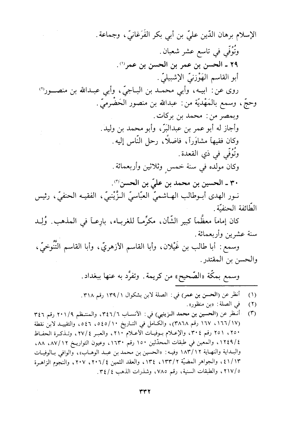 [3] انظر عن (الحسين بن محمد الزينبي) في: الأنساب 6/ 346، والمنتظم 9/ 201 رقم 346 (17/ 166، 167 رقم 3868) ، والكامل في التاريخ 10/ 545، 546، والتقييد لابن نقطة 250، 251 رقم 304، والإعلام بوفيات الأعلام 210، والعبر 4/ 27، وتذكرة الحفاظ 4/ 1249، والمعين في طبقات المحدّثين 150 رقم 1630، وعيون التواريخ 12/ 87، 88، والبداية والنهاية 12/ 183 وفيه: «الحسين بن محمد بن عبد الوهاب» ، والوافي بالوفيات 13/ 41، والجواهر المضيّة 2/ 133، 134، والعقد الثمين 4/ 206، 207، والنجوم الزاهرة 5/ 217، والطبقات السنية، رقم 785، وشذرات الذهب 4/ 34.