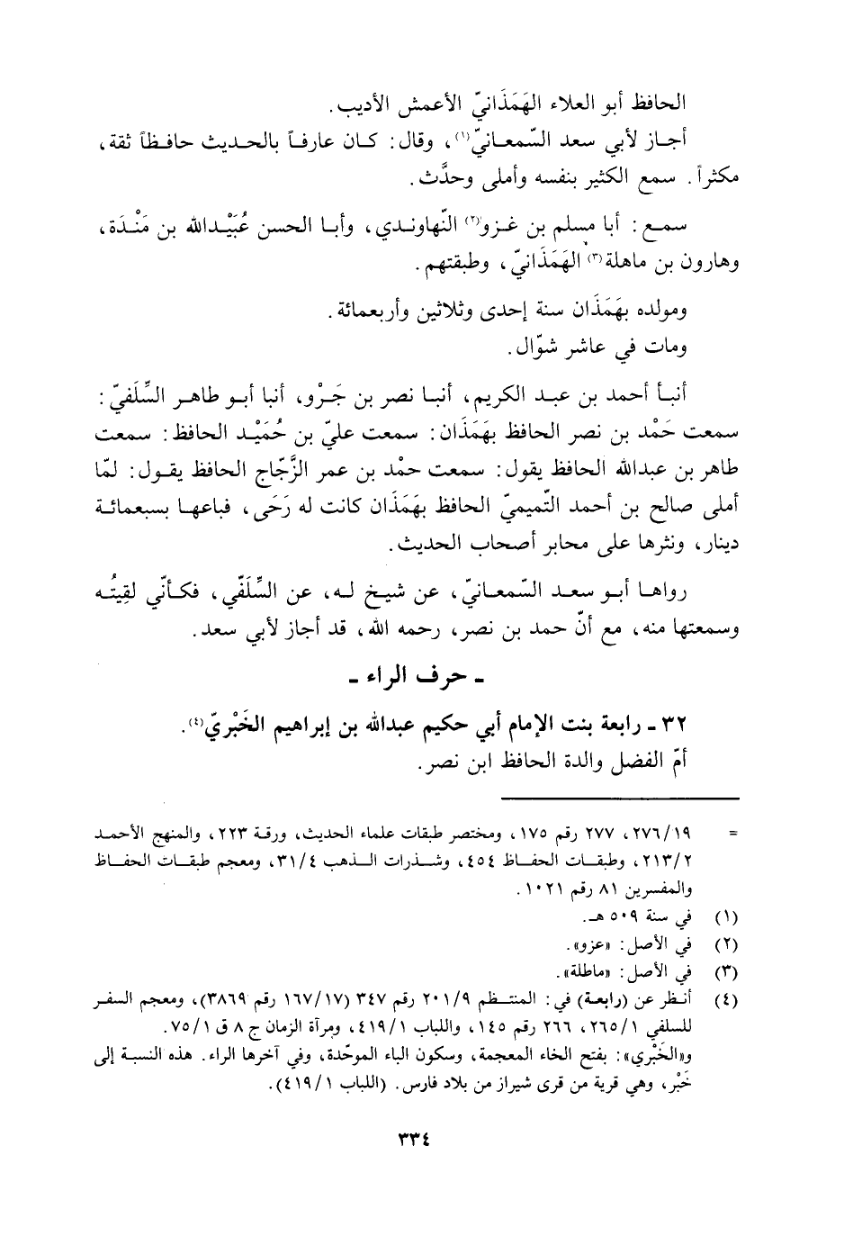 [4] انظر عن (رابعة) في: المنتظم 9/ 201 رقم 347 (17/ 167 رقم 3869) ، ومعجم السفر للسلفي 1/ 265، 266 رقم 145، واللباب 1/ 419، ومرآة الزمان ج 8 ق 1/ 75.