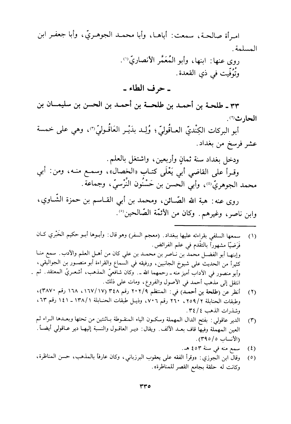 [2] انظر عن (طلحة بن أحمد) في: المنتظم 9/ 202 رقم 348 (17/ 167، 168 رقم 3870) ، وطبقات الحنابلة 2/ 259، 260 رقم 706، وذيل طبقات الحنابلة 1/ 138- 141 رقم 63، وشذرات الذهب 4/ 34.