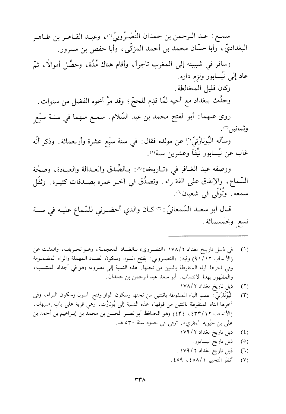[1] في ذيل تاريخ بغداد 2/ 178 «النضروي» بالضاد المعجمة، وهو تحريف، والمثبت عن (الأنساب 12/ 91) وفيه: «النصرويي: بفتح النون وسكون الصاد المهملة والراء المضمومة وفي آخرها الياء المنقوطة باثنتين من تحتها. هذه النسبة إلى نصرويه وهو في أجداد المنتسب، والمظهور بهذا الانتساب: أبو سعد عبد الرحمن بن حمدان.