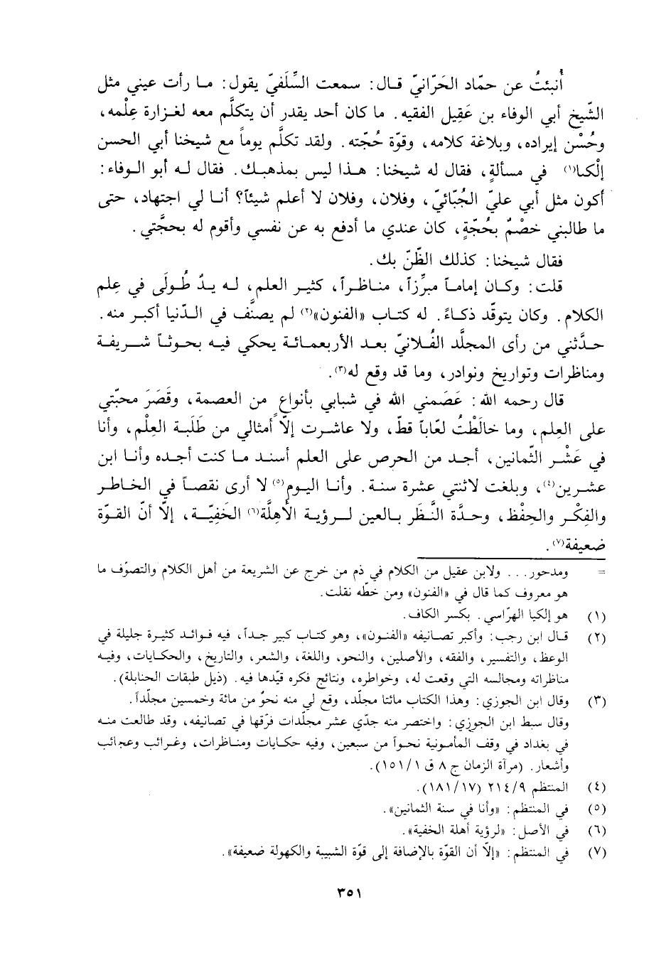 أُنبئتُ عَنْ حمّاد الحَرّانيّ قَالَ: سَمِعْتُ السّلَفيّ يَقُولُ: ما رأت عيني مثل الشَّيْخ أَبِي الوفاء بْن عقيل الفقيه. ما كَانَ أحد يقدر أن يتكلّم معه لغزارة عِلْمه، وحُسْن إيراده، وبلاغة كلامه، وقوّة حُجّته. ولقد تكلَّم يومًا مَعَ شيخنا أَبِي الحَسَن إلْكيا [1] في مسألةٍ، فقال لَهُ شيخنا: هذا لَيْسَ بمذهبك. فقال لَهُ أبو الوفاء: