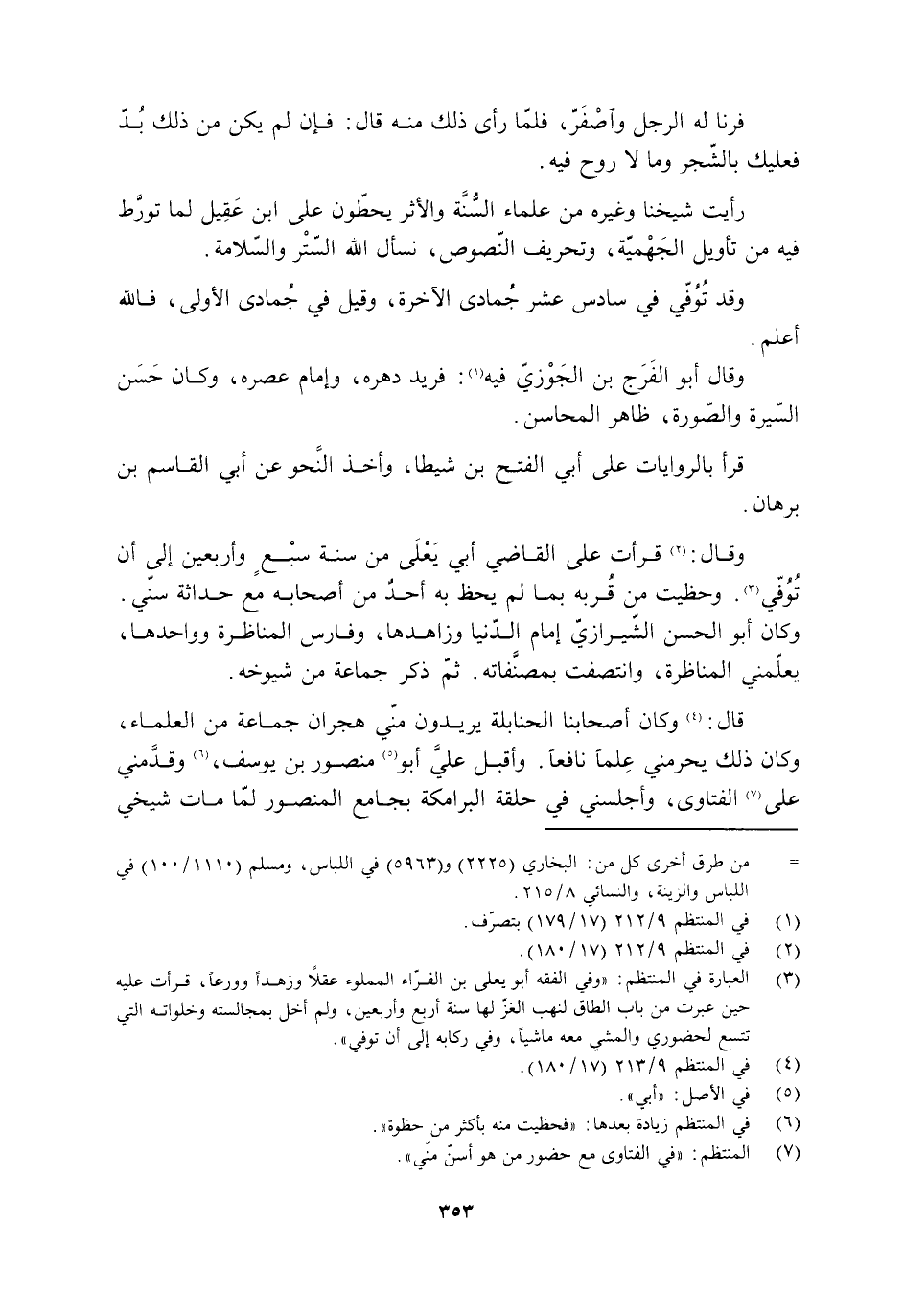 [3] العبارة في المنتظم: «وفي الفقه أبو يعلى بن الفرّاء المملوء عقلا وزهدا وورعا، قرأت عليه حين عبرت من باب الطاق لنهب الغزّ لها سنة أربع وأربعين، ولم أخل بمجالسته وخلواته التي تتسع لحضوري والمشي معه ماشيا، وفي ركابه إلى أن توفي» .
