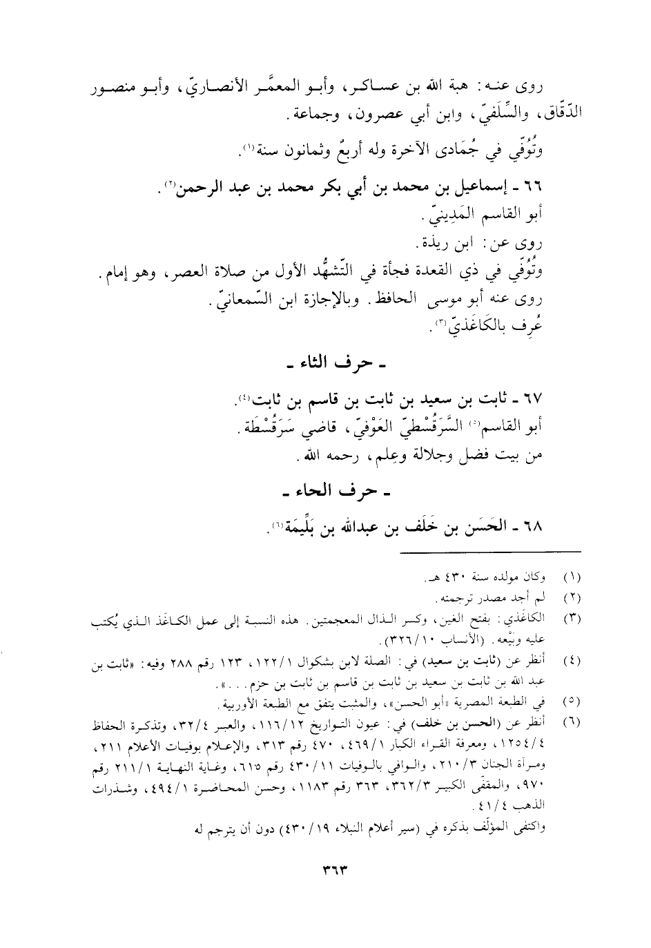 [3] الكاغذي: بفتح الغين، وكسر الذال المعجمتين. هذه النسبة إلى عمل الكاغذ الّذي يكتب عليه وبيعه. (الأنساب 10/ 326) .