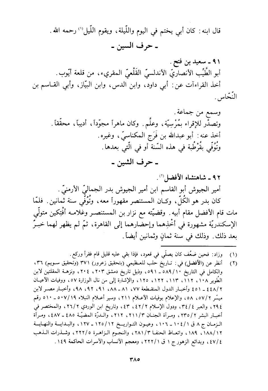 [2] انظر عن (الأفضل) في: تاريخ حلب للعظيميّ (بتحقيق زعرور) 371 (وتحقيق سويم) 36، والكامل في التاريخ 10/ 589- 591، وذيل تاريخ دمشق 203، 204، ونزهة المقلتين لابن الطوير 108، 112، 113، 122، 125، والإشارة إلى من نال الوزارة 57، ووفيات الأعيان 2/ 448- 451 وأخبار الدول المنقطعة 77، 81- 88، 91، 92، 98، وأخبار مصر لابن ميسّر 2/ 57، 58، والإعلام بوفيات الأعلام 211، وسير أعلام النبلاء 19/ 507- 510 رقم 294، والعبر 4/ 34، ودول الإسلام 2/ 42، 43، وتاريخ ابن الوردي 2/ 26، والمختصر في أخبار البشر 2/ 235، ومرآة الجنان 3/ 211، 212، والدرّة المضيّة 485- 487، ومرآة الزمان ج 8 ق 1/ 104- 106، وعيون التواريخ 12/ 125- 127، والبداية والنهاية 12/ 188، 189، واتعاظ الحنفا 3/ 281، والنجوم الزاهرة 5/ 222، وشذرات الذهب 4/ 47، وبدائع الزهور ج 1 ق 1/ 222، ومعجم الأنساب والأسرات الحاكمة 149.