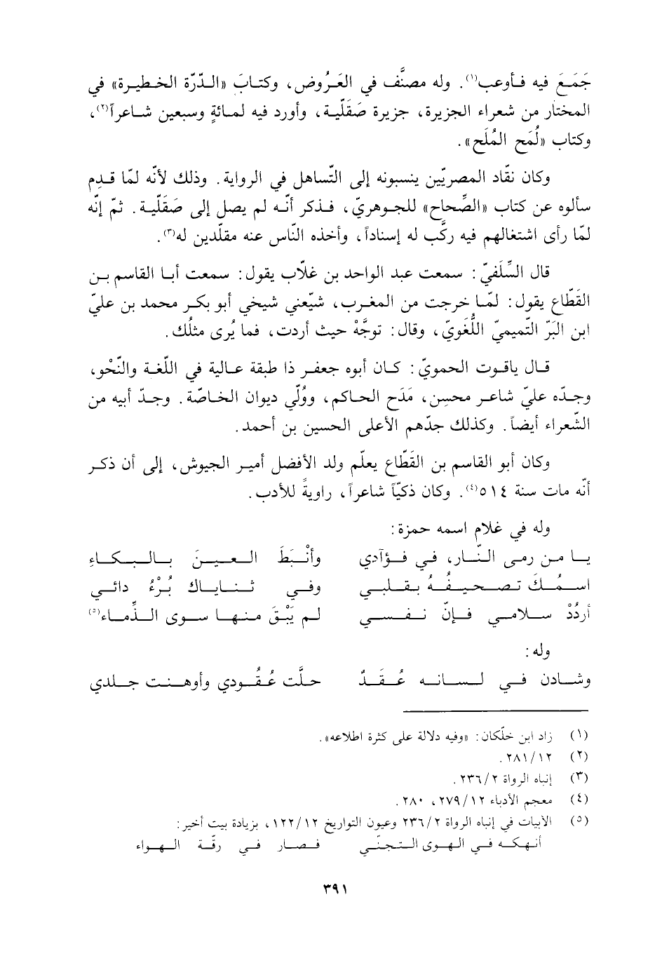 [5] الأبيات في إنباه الرواة 2/ 236 وعيون التواريخ 12/ 122، بزيادة بيت أخير: