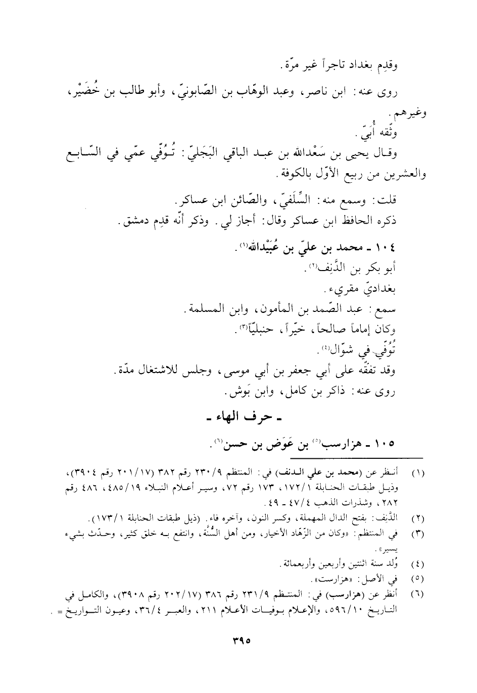 [6] انظر عن (هزارسب) في: المنتظم 9/ 231 رقم 386 (17/ 202 رقم 3908) ، والكامل في التاريخ 10/ 596، والإعلام بوفيات الأعلام 211، والعبر 4/ 36، وعيون التواريخ