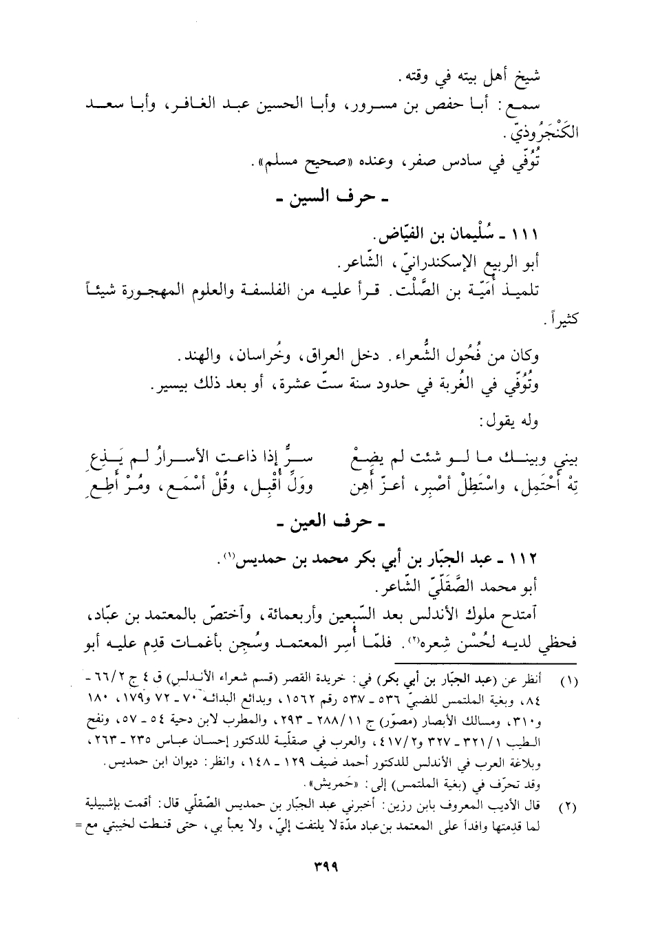 [1] انظر عن (عبد الجبّار بن أبي بكر) في: خريدة القصر (قسم شعراء الأندلس) ق 4 ج 2/ 66- 84، وبغية الملتمس للضبيّ 536- 537 رقم 1562، وبدائع البدائه 70- 72 و 179، 180 و 310، ومسالك الأبصار (مصوّر) ج 11/ 288- 293، والمطرب لابن دحية 54- 57، ونفح الطيب 1/ 321- 327 و 2/ 417، والعرب في صقلّيّة للدكتور إحسان عباس 235- 263، وبلاغة العرب في الأندلس للدكتور أحمد ضيف 129- 148، وانظر: ديوان ابن حمديس.