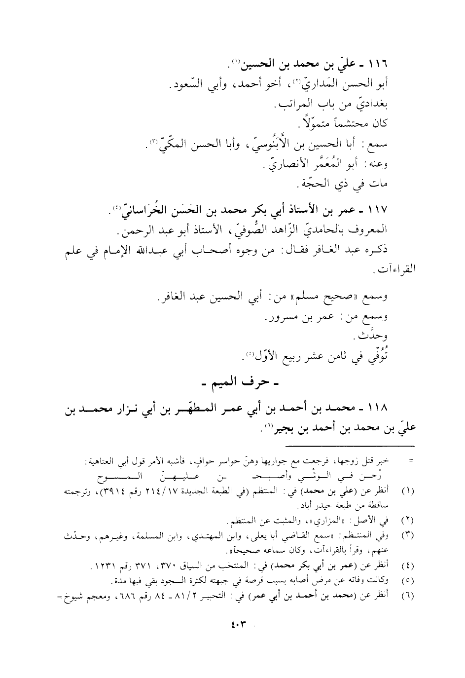 [1] انظر عن (علي بن محمد) في: المنتظم (في الطبعة الجديدة 17/ 214 رقم 3914) ، وترجمته ساقطة من طبعة حيدرآباد.