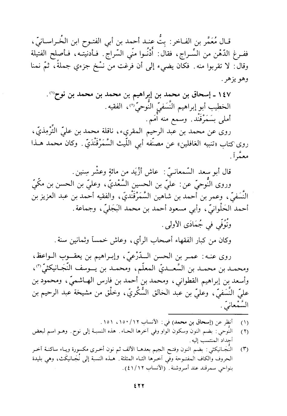 [3] النّجانيكثي: بضم النون وفتح الجيم بعدها الألف ثم نون أخرى مكسورة وياء ساكنة آخر الحروف والكاف المفتوحة وفي آخرها الثاء المثلثة. هذه النسبة إلى نجانيكث، وهي بليدة بنواحي سمرقند عند أسروشنة. (الأنساب 12/ 41) .