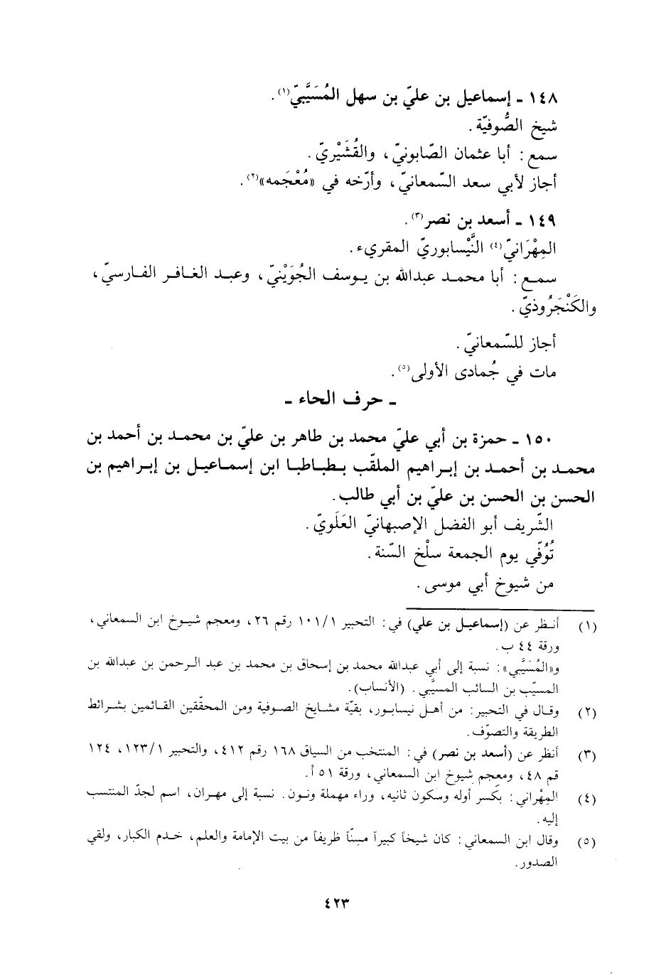 [3] انظر عن (أسعد بن نصر) في: المنتخب من السياق 168 رقم 412، والتحبير 1/ 123، 124 قم 48، ومعجم شيوخ ابن السمعاني، ورقة 51 أ.