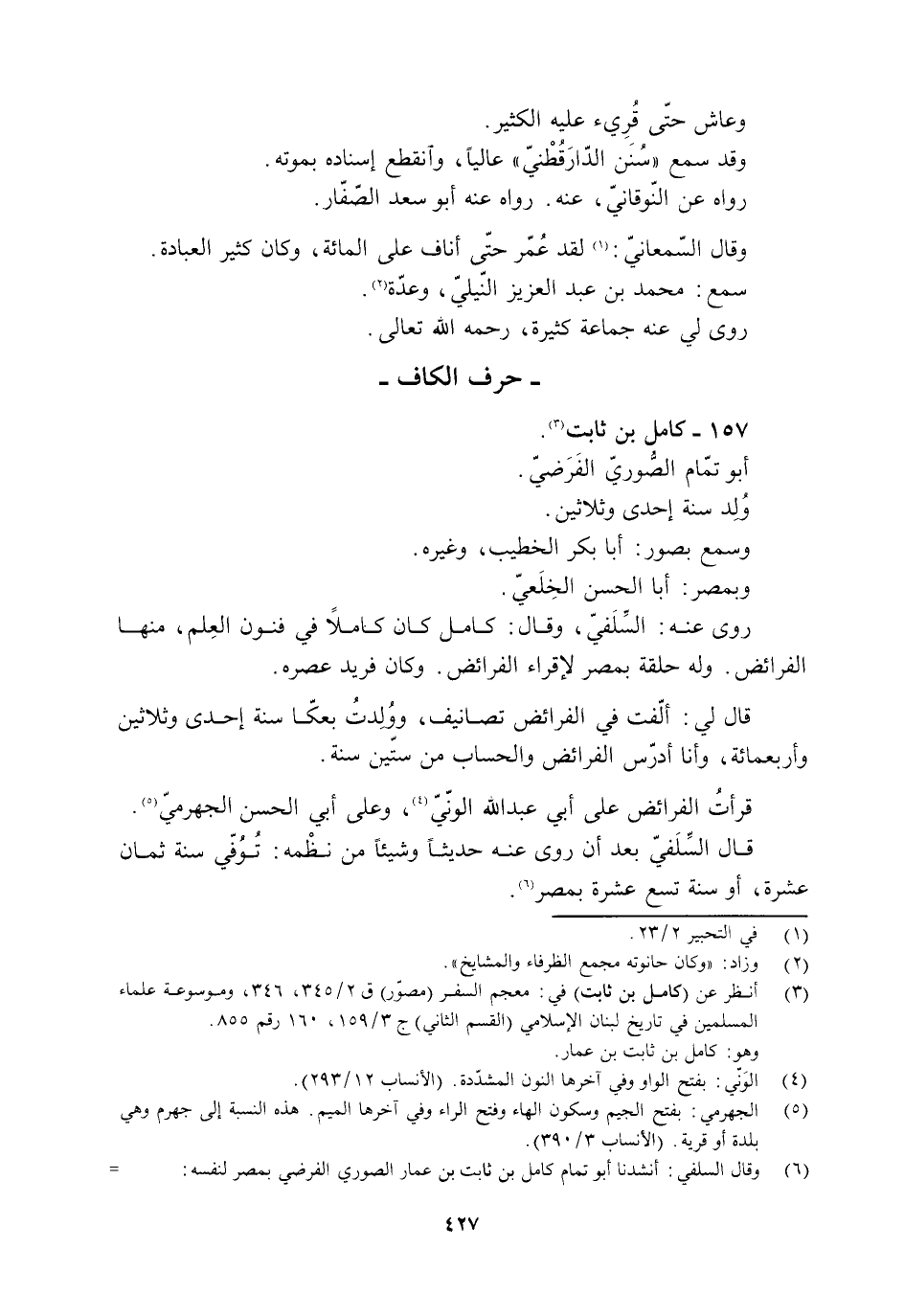 [3] انظر عن (كامل بن ثابت) في: معجم السفر (مصوّر) ق 2/ 345، 346، وموسوعة علماء المسلمين في تاريخ لبنان الإسلامي (القسم الثاني) ج 3/ 159، 160 رقم 855.