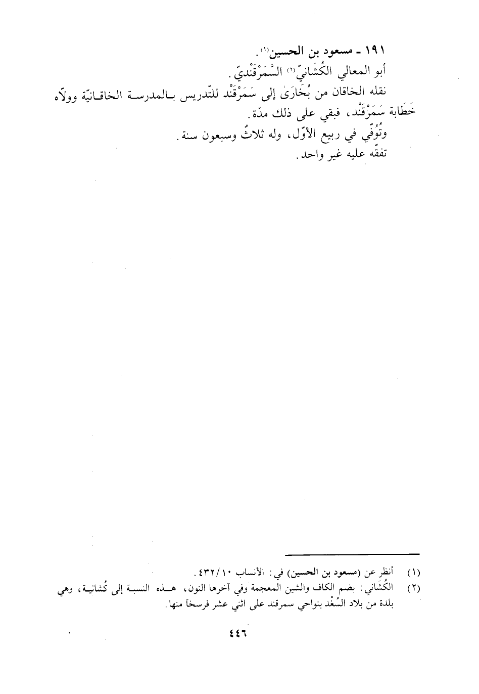 [2] الكشاني: بضم الكاف والشين المعجمة وفي آخرها النون، هذه النسبة إلى كشانية، وهي بلدة من بلاد السغد بنواحي سمرقند على اثني عشر فرسخا منها.