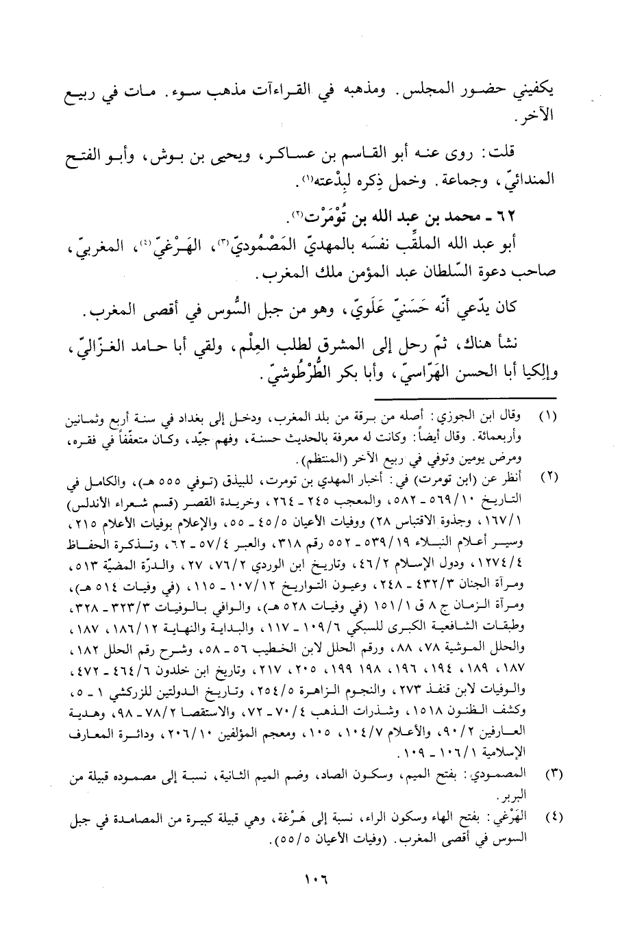 [2] انظر عن (ابن تومرت) في: أخبار المهدي بن تومرت، للبيذق (توفي 555 هـ) ، والكامل في التاريخ 10/ 569- 582، والمعجب 245- 264، وخريدة القصر (قسم شعراء الأندلس) 1/ 167، وجذوة الاقتباس 28) ووفيات الأعيان 5/ 45- 55، والإعلام بوفيات الأعلام 215، وسير أعلام النبلاء 19/ 539- 552 رقم 318، والعبر 4/ 57- 62، وتذكرة الحفاظ 4/ 1274، ودول الإسلام 2/ 46، وتاريخ ابن الوردي 2/ 76، 27، والدرّة المضيّة 513، ومرآة الجنان 3/ 432- 248، وعيون التواريخ 12/ 107- 115، (في وفيات 514 هـ.) ، ومرآة الزمان ج 8 ق 1/ 151 (في وفيات 528 هـ) ، والوافي بالوفيات 3/ 323- 328، وطبقات الشافعية الكبرى للسبكي 6/ 109- 117، والبداية والنهاية 12/ 186، 187، والحلل الموشية 78، 88، ورقم الحلل لابن الخطيب 56- 58، وشرح رقم الحلل 182، 187، 189، 194، 196، 198، 199، 205، 217، وتاريخ ابن خلدون 6/ 464- 472، والوفيات لابن قنفذ 273، والنجوم الزاهرة 5/ 254، وتاريخ الدولتين للزركشي 1- 5، وكشف الظنون 1518، وشذرات الذهب/ 70- 72، والاستقصاء 2/ 78- 98، وهدية العارفين 2/ 90، والأعلام 7/ 104، 105، ومعجم المؤلفين 10/ 206، ودائرة المعارف الإسلامية 1/ 106- 109.