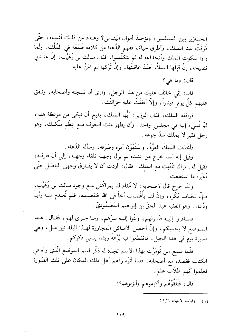 الخنازير بين المسلمين، وتؤخذ أموال اليتامى؟ وعدّد من ذلك أشياء، حتّى ذَرَفَتْ عينا الملك، وأطرق حياءً، ففهم الدُّهاة من كلامه طَمَعَه في المُلْك. ولّما رأوا سكوت الملك وانخداعه له لم يتكلّموا، فقال مالك بن وُهَيْب: إنّ عندي نصيحة، إنْ قبِلَها الملكُ حَمَدَ عاقبتها، وإنْ تَرَكَها لم آمَنْ عليه.