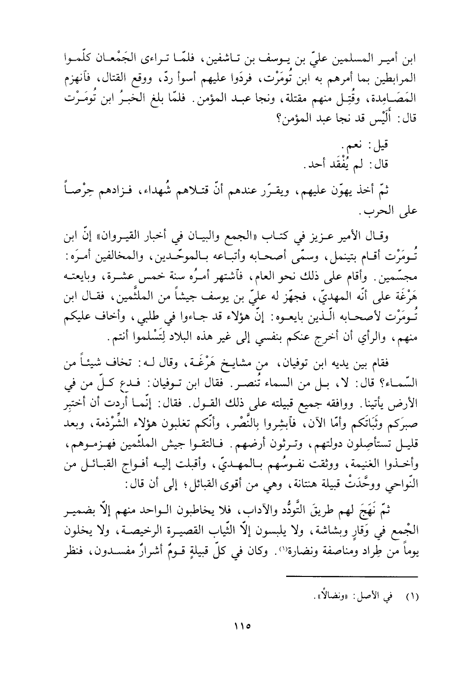 فقام بين يده ابن توفيان، من مشايخ هَرْغَة، وقال له: تخاف شيئا من السّماء؟ قال: لَا، بل من السّماء تُنصر. فقال ابن توفيان: فدع كل من في الأرض يأتينا. ووافقه جميع قبيلته على ذَلِكَ القول. فقال: إنما أردت أن أختبر صبرَكم وثَبَاتَكم وأمّا الآن، فأبشروا بالنَّصْر، وأنكم تغلبون هؤلاء الشِّرْذمة، بعد قليل تستأصِلون دولتهم، وترثون أرضهم. فالتقوا جيش الملثمين فهزموهم، وأخذوا الغنيمة، ووثقت نفوسُهم بالمهديّ، وأقبلت إليه أفواج القبائل من النّواحي ووحَّدَتْ قبيلة هنتاتة، وهي من أقوى القبائل، إلى أن قال: