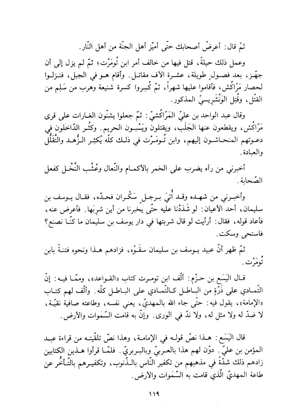 قال اليَسَع: هذا نصّ قوله في الإمامة، وهذا نصّ تلقّيته من قراءة عبد المؤمن بن عليّ. دوّن لهم هذا بالعربيّ وبالبربريّ. فلمّا قرءوا هذين الكتابين زادهم ذلك شدَّةً في مذهبهم من تكفير النّاس بالذّنوب، وتكفيرهم بالذّنوب، وتكفيرهم بالتّأخُّر عن طاعة المهديّ الّذي قامت به السّماوات والأرض.