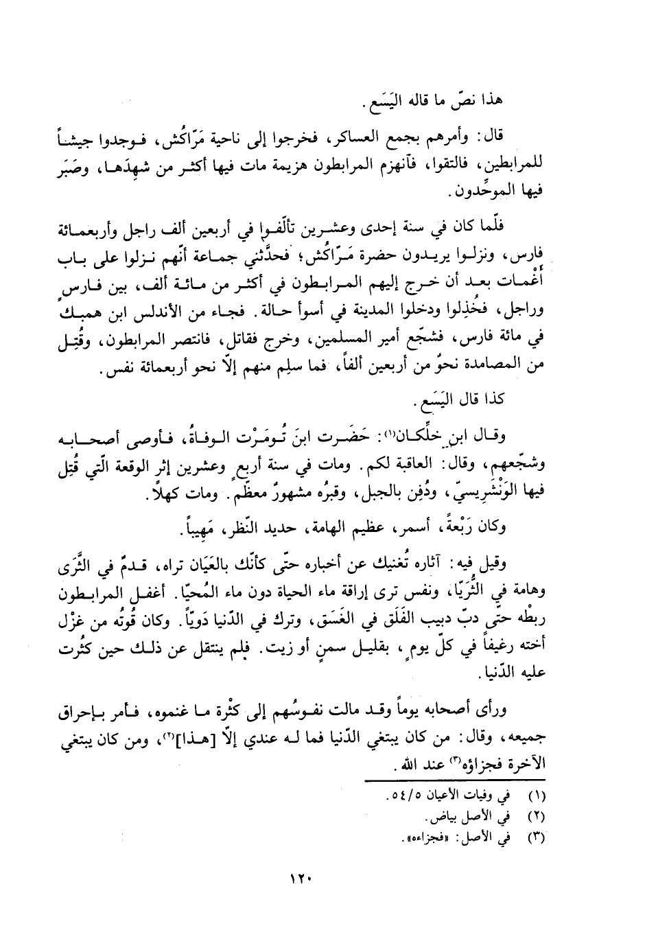 قال: وأمرهم بجمع العساكر، فخرجوا إلى ناحية مَرّاكُش، فوجدوا جيشًا للمرابطين، فالتقوا، فانهزم المرابطون هزيمة مات فيها أكثر من شهِدَها، وصَبَر فيها الموحِّدون.