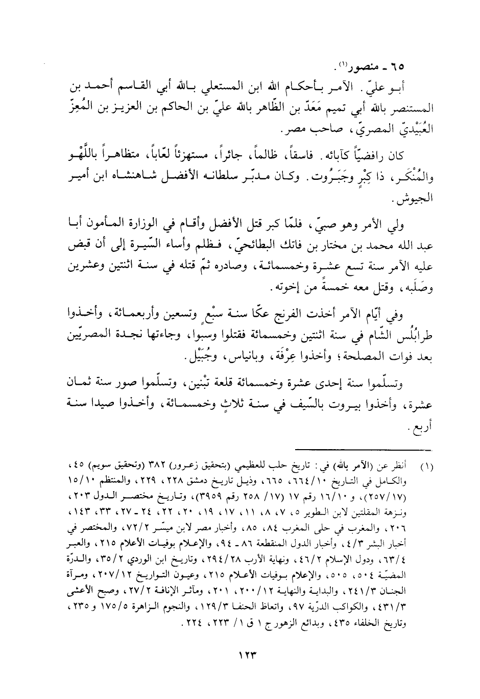 [1] انظر عن (الآمر باللَّه) في: تاريخ حلب للعظيميّ (بتحقيق زعرور) 382 (وتحقيق سويم) 45، والكامل في التاريخ 10/ 664، 665، وذيل تاريخ دمشق 228، 229، والمنتظم 10/ 15 (17/ 257) ، و 10/ 16 رقم 17 (17/ 258 رقم 3959) ، وتاريخ مختصر الدول 203، ونزهة المقلتين لابن الطوير 5، 7، 8، 11، 17، 19، 20، 22، 24- 27، 33، 143، 206، والمغرب في حلى المغرب 84، 85، وأخبار مصر لابن ميسّر 2/ 72، والمختصر في أخبار البشر 3/ 4، وأخبار الدول المنقطعة 86- 94، والإعلام بوفيات الأعلام 215، والعبر 4/ 63، ودول الإسلام 2/ 46، ونهاية الأرب 28/ 294، وتاريخ ابن الوردي 2/ 35، والدرّة المضيّة 504، 505، والإعلام بوفيات الأعلام 215، وعيون التواريخ 12/ 207، ومرآة الجنان 3/ 241، والبداية والنهاية 12/ 200، 201، ومآثر الإنافة 2/ 27، وصبح الأعشى 3/ 431، والكواكب الدرّية 97، واتعاظ الحنفا 3/ 129، والنجوم الزاهرة 5/ 175 و 235، وتاريخ الخلفاء 435، وبدائع الزهور ج 1 ق 1/ 223، 224.