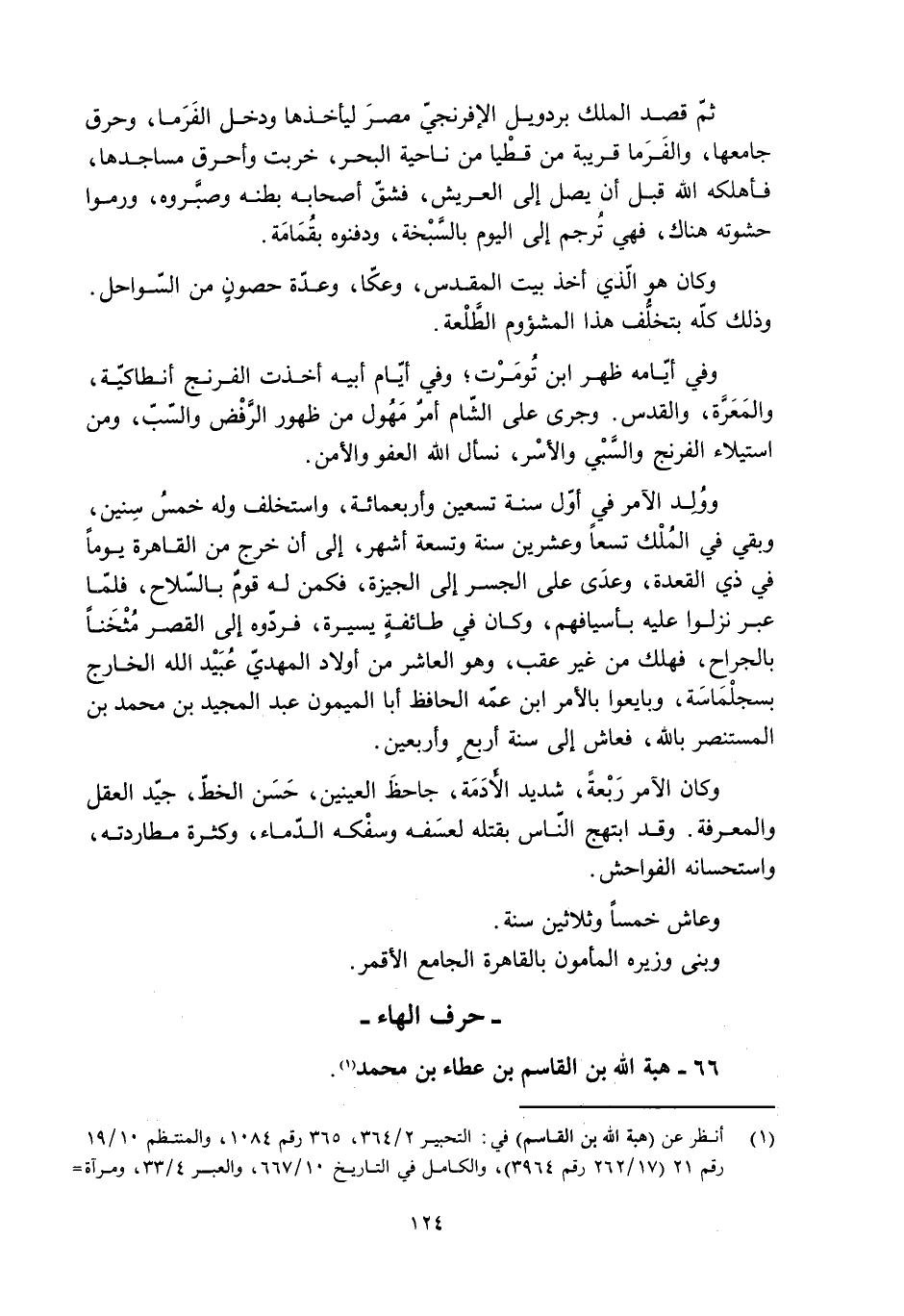 [1] انظر عن (هبة الله بن القاسم) في: التحبير 2/ 364، 365 رقم 1084، والمنتظم 10/ 19 رقم 21 (17/ 262 رقم 3964) ، والكامل في التاريخ 10/ 667، والعبر 4/ 33، ومرآة