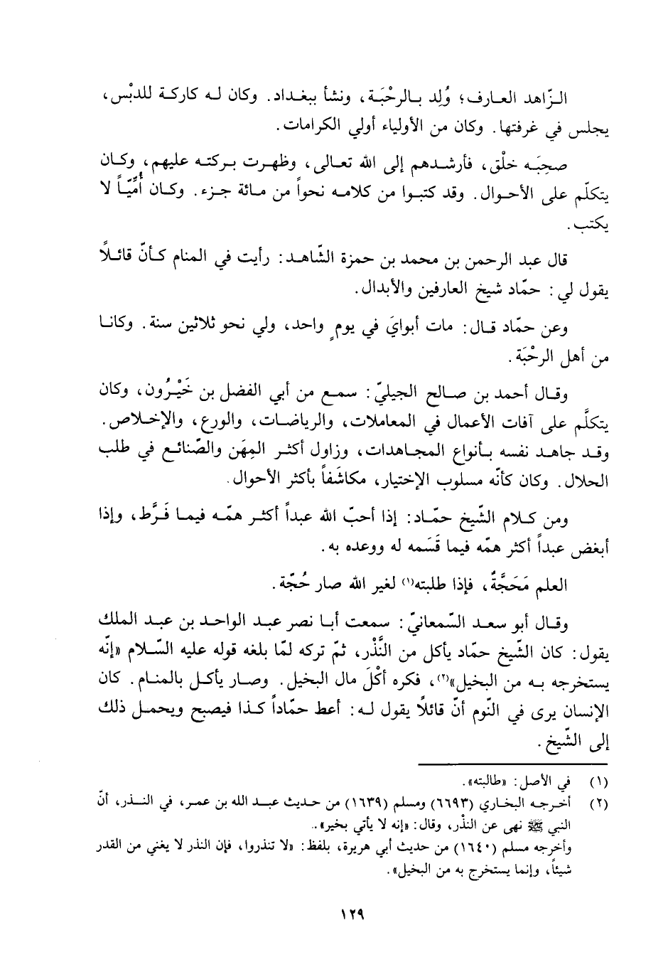 وقال أبو سعد السّمعانيّ: سمعت أبا نصر عبد الواحد بن عبد الملك يقول: كان الشَيخ حمّاد يأكل من النَّذْر، ثمّ تركه لمّا بلغه قوله عليه السّلام «إنّه يستخرجه به من البخيل» [2] ، فكره أكْلَ مال البخيل. وصار يأكل بالمنام. كان الإنسان يرى في النّوم أنّ قائلًا يقول له: أعط حمّادًا كذا فيصبح ويحمل ذلك إلى الشَيخ.