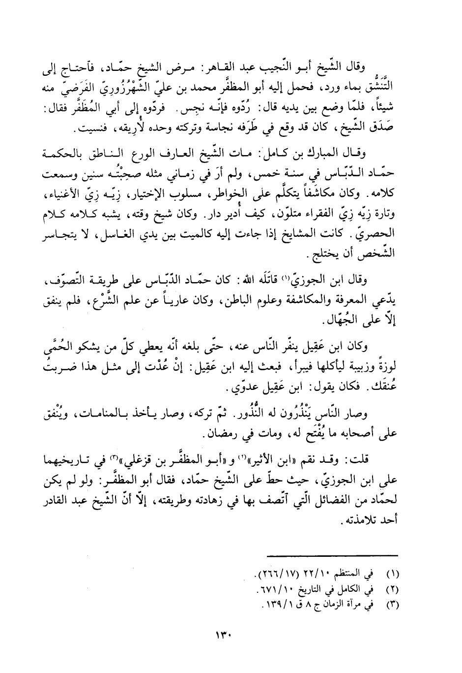 قلت: وقد نقم «ابن الأثير» [2] و «أبو المظفَّر بن قزغليّ» [3] في تاريخيهما على ابن الجوزيّ، حيث حطّ على الشَيخ حمّاد، فقال أبو المظفَّر: ولو لم يكن لحمّاد من الفضائل الّتي اتّصف بها في زهادته وطريقته، إلّا أنّ الشَيخ عبد القادر أحد تلامذته.