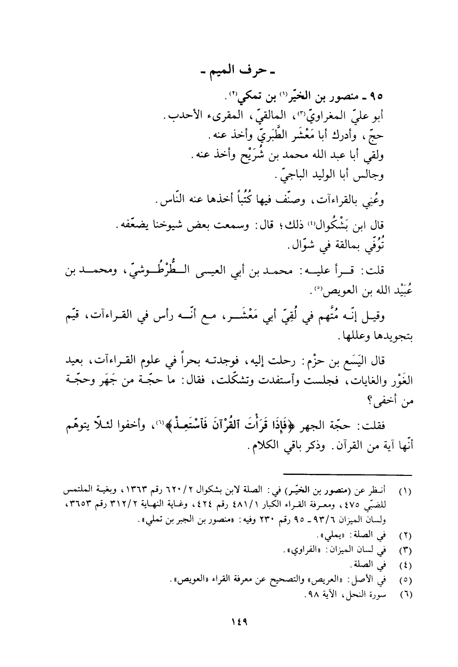 [1] انظر عن (منصور بن الخيّر) في: الصلة لابن بشكوال 2/ 620 رقم 1363، وبغية الملتمس للضبّي 475، ومعرفة القراء الكبار 1/ 481 رقم 424، وغاية النهاية 2/ 312 رقم 3653، ولسان الميزان 6/ 93- 95 رقم 230 وفيه: «منصور بن الجبر بن تملي» .