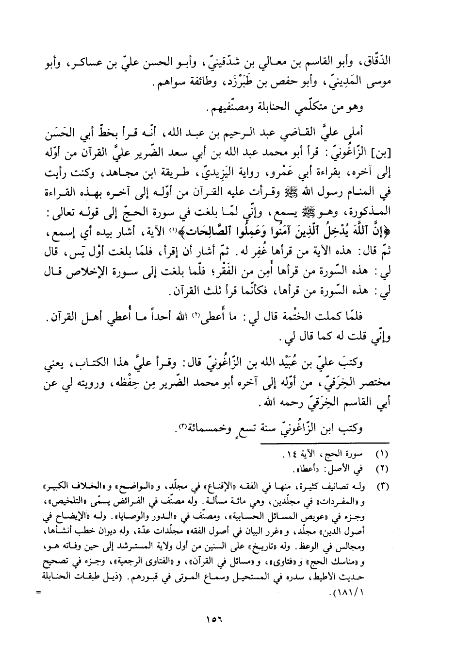 أملى عليّ القاضي عبد الرحيم بن عبد الله، أنّه قرأ بخطّ أبي الحسن [بن] الزاغُونيّ: قرأ أبو محمد عبد الله بن أبي سعد الضّرير عليَّ القرآن من أوّله إلى آخره، بقراءة أبي عَمْرو، رواية اليَزِيديّ، طريقة ابن مجاهد، وكنت رأيت في المنام رسول الله صَلَّى اللَّهُ عَلَيْهِ وَسَلَّمَ وقرأت عليه القرآن من أوله إلى آخره بهذه القراءة المذكورة، وهو صَلَّى اللَّهُ عَلَيْهِ وسلّم يسمع، وإنّي لمّا بلغت في سورة الحجّ إلى قوله تعالى: