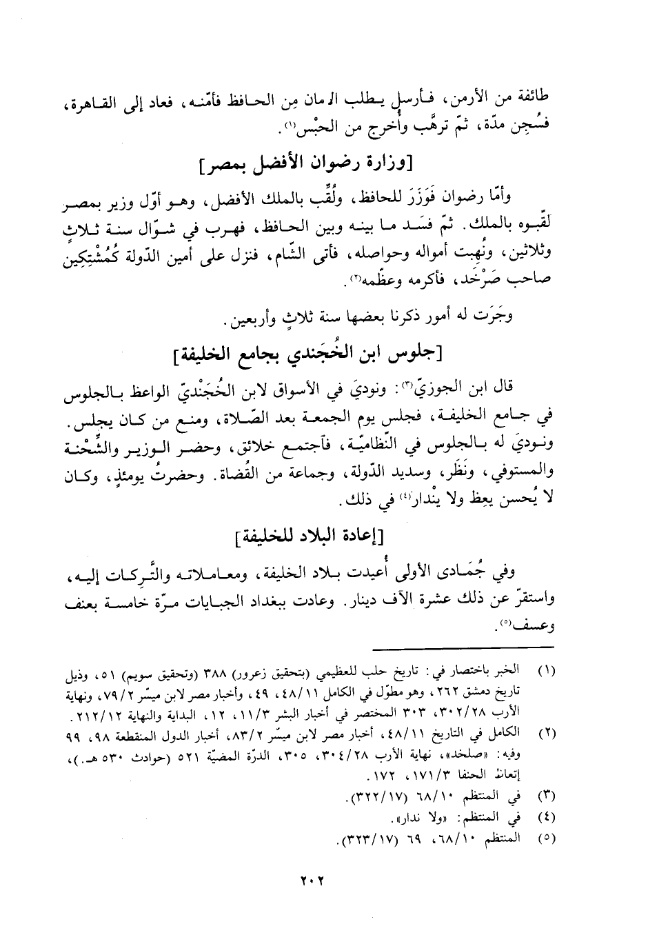 [1] الخبر باختصار في: تاريخ حلب للعظيميّ (بتحقيق زعرور) 388 (وتحقيق سويم) 51، وذيل تاريخ دمشق 262، وهو مطوّل في الكامل 11/ 48، 49، وأخبار مصر لابن ميسّر 2/ 79، ونهاية الأرب 28/ 302، 303 المختصر في أخبار البشر 3/ 11، 12، البداية والنهاية 12/ 212.