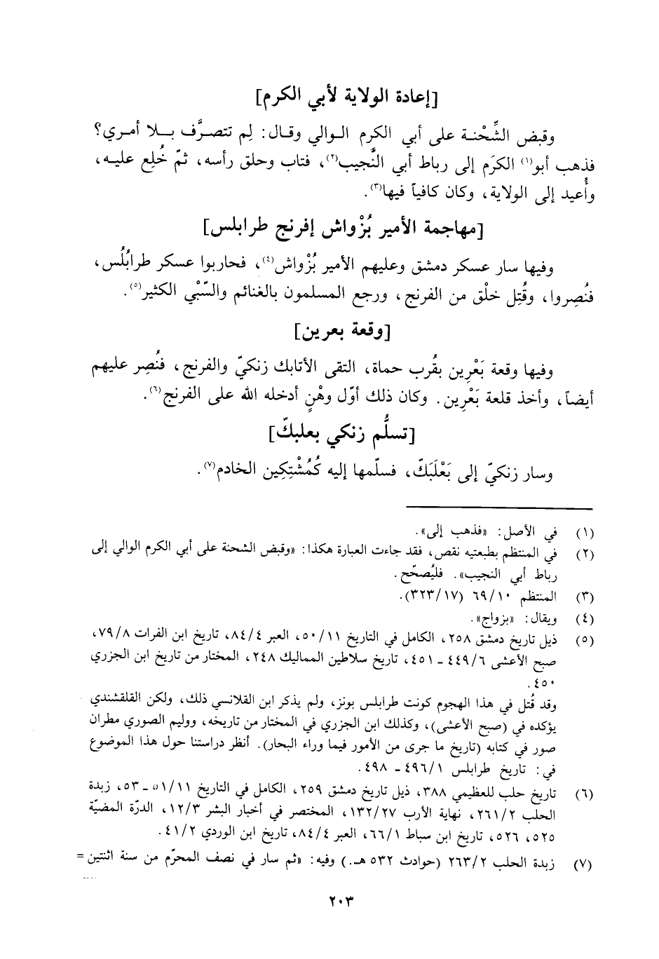 وفيها سار عسكر دمشق وعليهم الأمير بُزْواش [4] ، فحاربوا عسكر طرابُلُس، فنُصِروا، وَقُتِلَ خلْق من الفرنج، ورجع المسلمون بالغنائم والسّبْي الكثير [5] .