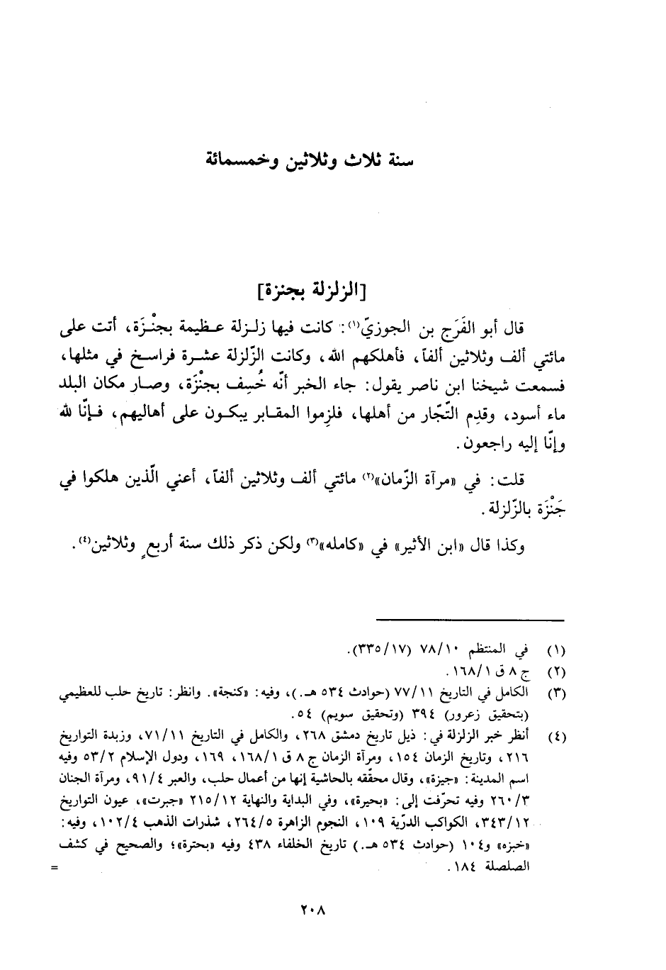 [4] انظر خبر الزلزلة في: ذيل تاريخ دمشق 268، والكامل في التاريخ 11/ 71، وزبدة التواريخ 216، وتاريخ الزمان 154، ومرآة الزمان ج 8 ق 1/ 168، 169، ودول الإسلام 2/ 53 وفيه اسم المدينة: «جيزة» ، وقال محقّقه بالحاشية إنها من أعمال حلب، والعبر 4/ 91، ومرآة الجنان 3/ 260 وفيه تحرّفت إلى: «بحيرة» ، وفي البداية والنهاية 12/ 215 «جبرت» ، عيون التواريخ 12/ 343، الكواكب الدرّية 109، النجوم الزاهرة 5/ 264، شذرات الذهب 4/ 102، وفيه:
