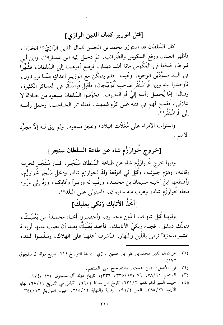 [3] المنتظم 10/ 78، 79 (17/ 335، 336) ، تاريخ دولة آل سلجوق 173 و 174.