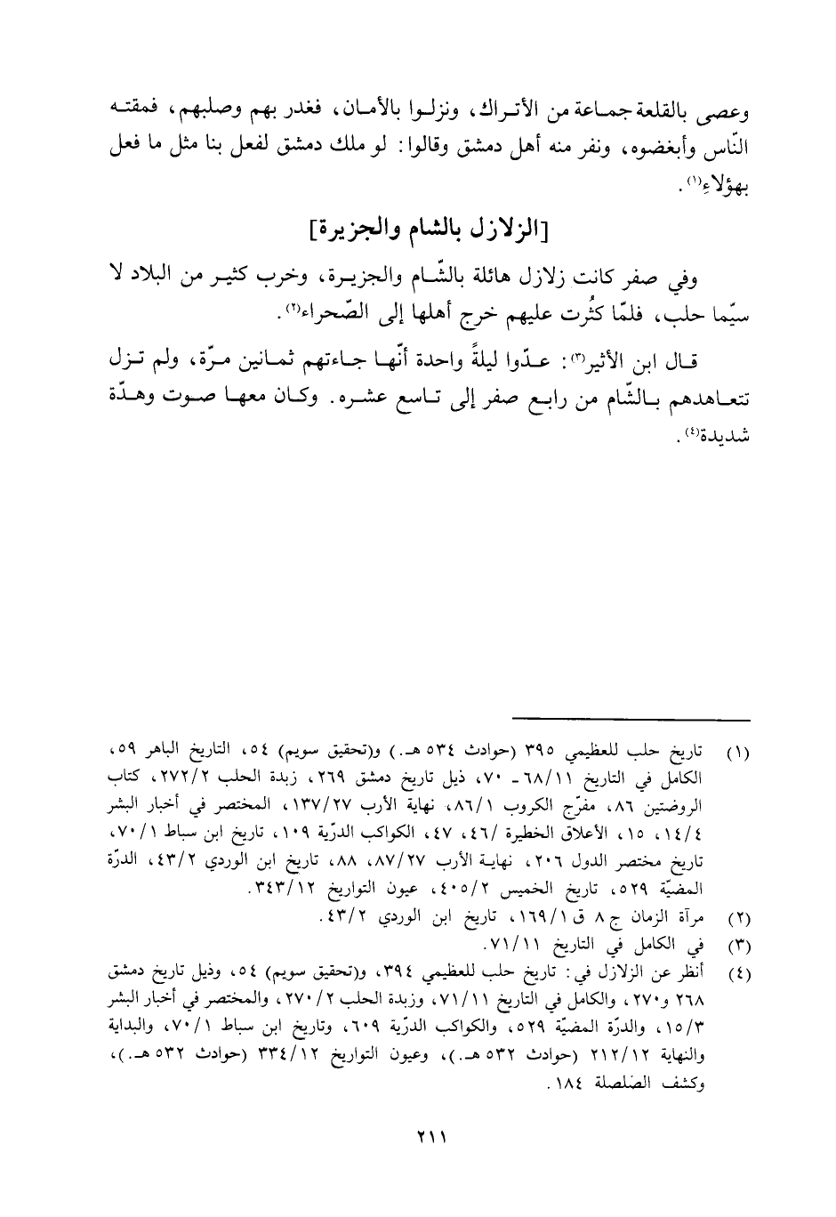 [4] انظر عن الزلازل في: تاريخ حلب للعظيميّ 394، و (تحقيق سويم) 54، وذيل تاريخ دمشق 268 و 270، والكامل في التاريخ 11/ 71، وزبدة الحلب 2/ 270، والمختصر في أخبار البشر 3/ 15، والدرّة المضيّة 529، والكواكب الدرّية 609، وتارخى ابن سباط 1/ 70، والبداية والنهاية 12/ 212 (حوادث 532 هـ.) ، وعيون التواريخ 12/ 334 (حوادث 532 هـ.) ، وكشف الصلصلة 184.