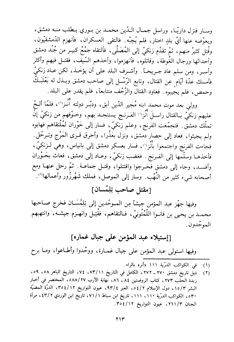 [2] ذيل تاريخ دمشق 270- 272، الكامل في التاريخ 11/ 73، 74، التاريخ الباهر 58، 59، زبدة الحلب 273، كتاب الروضتين 84- 86، نهاية الأرب 27/ 588، المختصر في أخبار البشر 3/ 15، دول الإسلام 2/ 54، العبر 4/ 93، عيون التواريخ 12/ 354، الدرّة المضيّة 530، الكواكب الدرّية 110، 111، تاريخ ابن سباط 1/ 71، تاريخ ابن الوردي 2/ 43، مرآة الجنان 3/ 261، عيون التواريخ 12/ 354.
