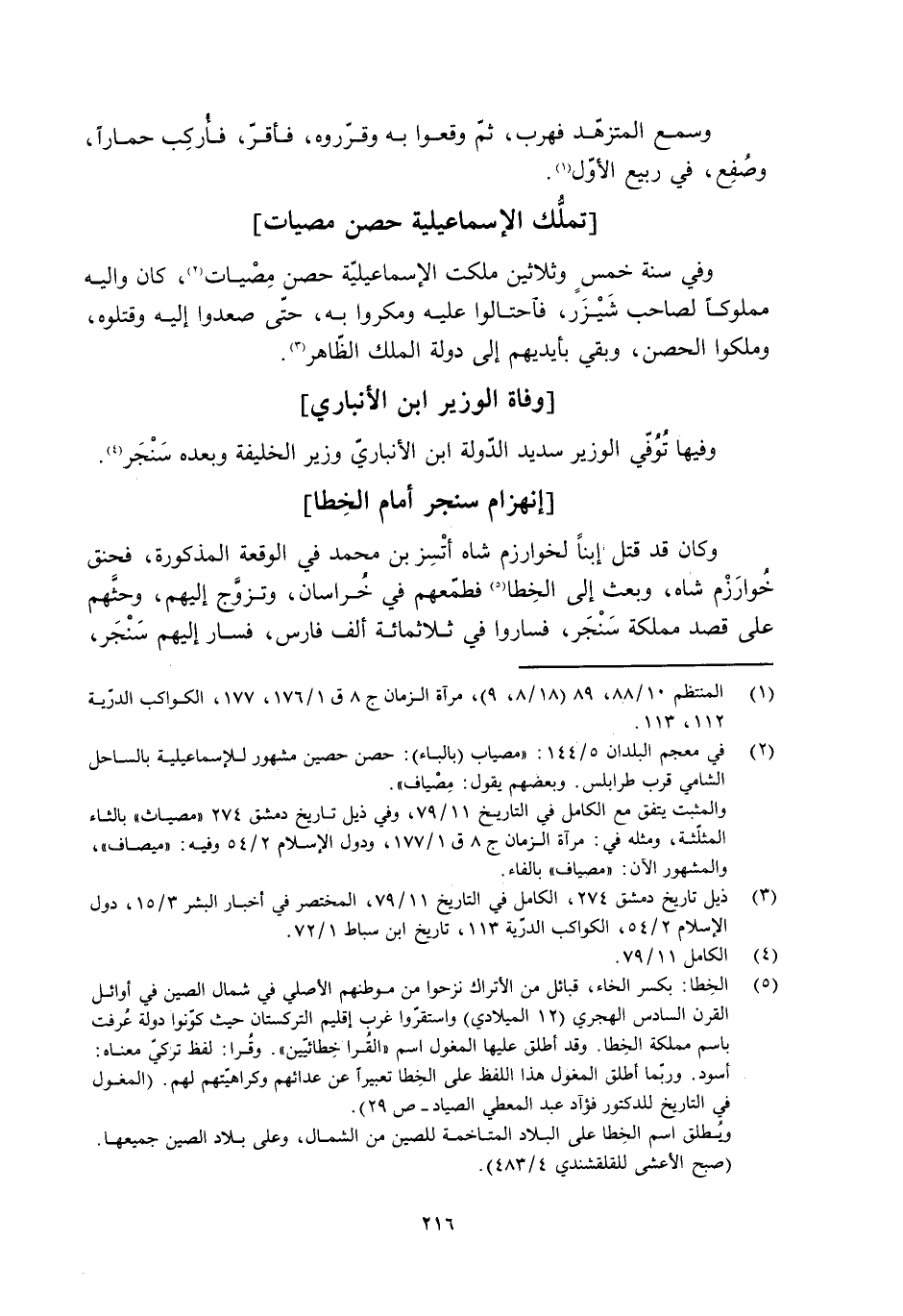 وفي سنة خمسٍ وثلاثين ملكت الإسماعيلية حصن مِصْيات [2] ، كان واليه مملوكًا لصاحب شَيْزَر، فاحتالوا عليه ومكروا به، حتّى صعدوا إليه وقتلوه، وملكوا الحصن، وبقي بأيديهم إلى دولة الملك الظّاهر [3] .