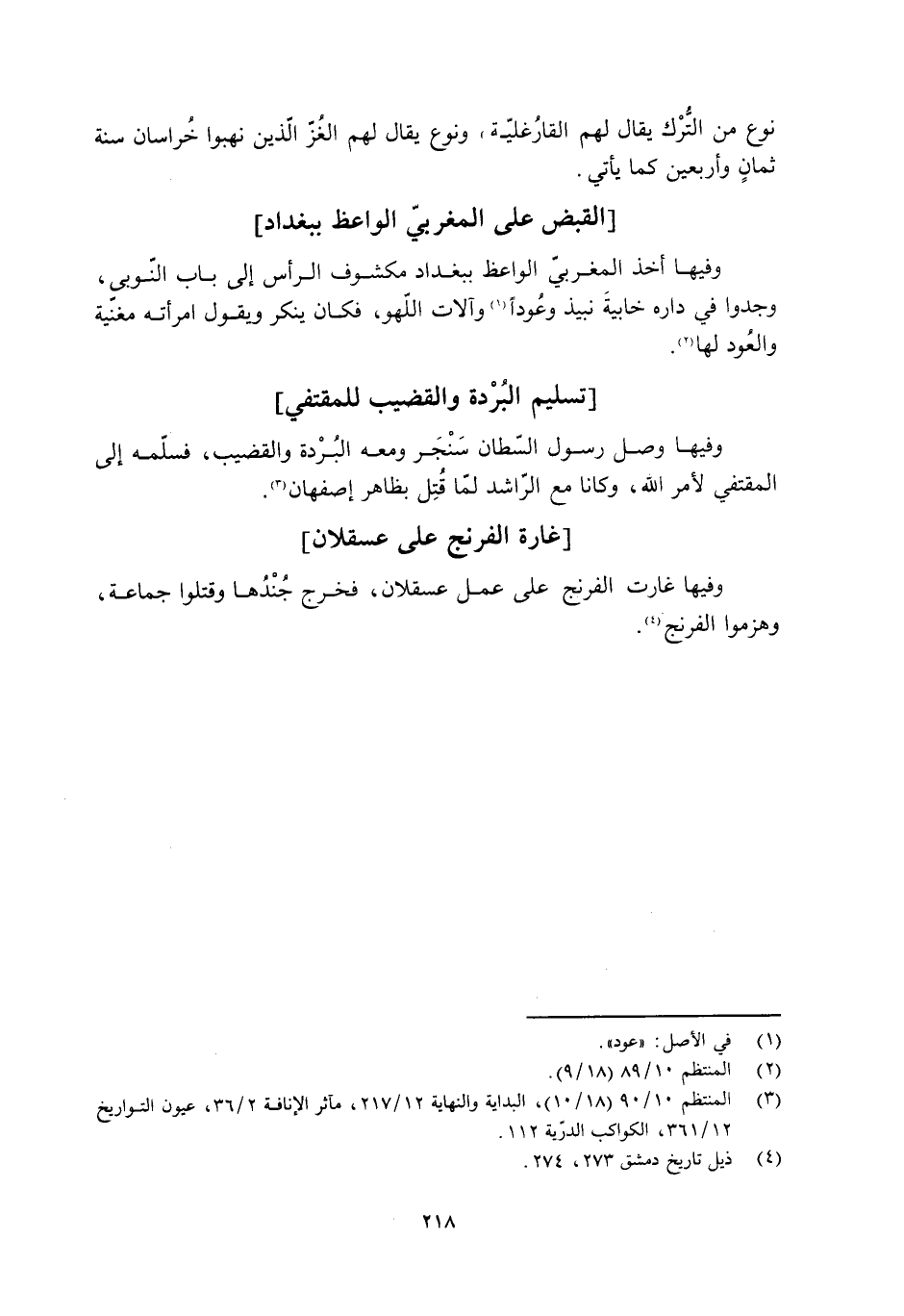 [3] المنتظم 10/ 90 (18/ 10) ، البداية والنهاية 12/ 217، مآثر الإنافة 2/ 36، عيون التواريخ 12/ 361، الكواكب الدرّية 112.