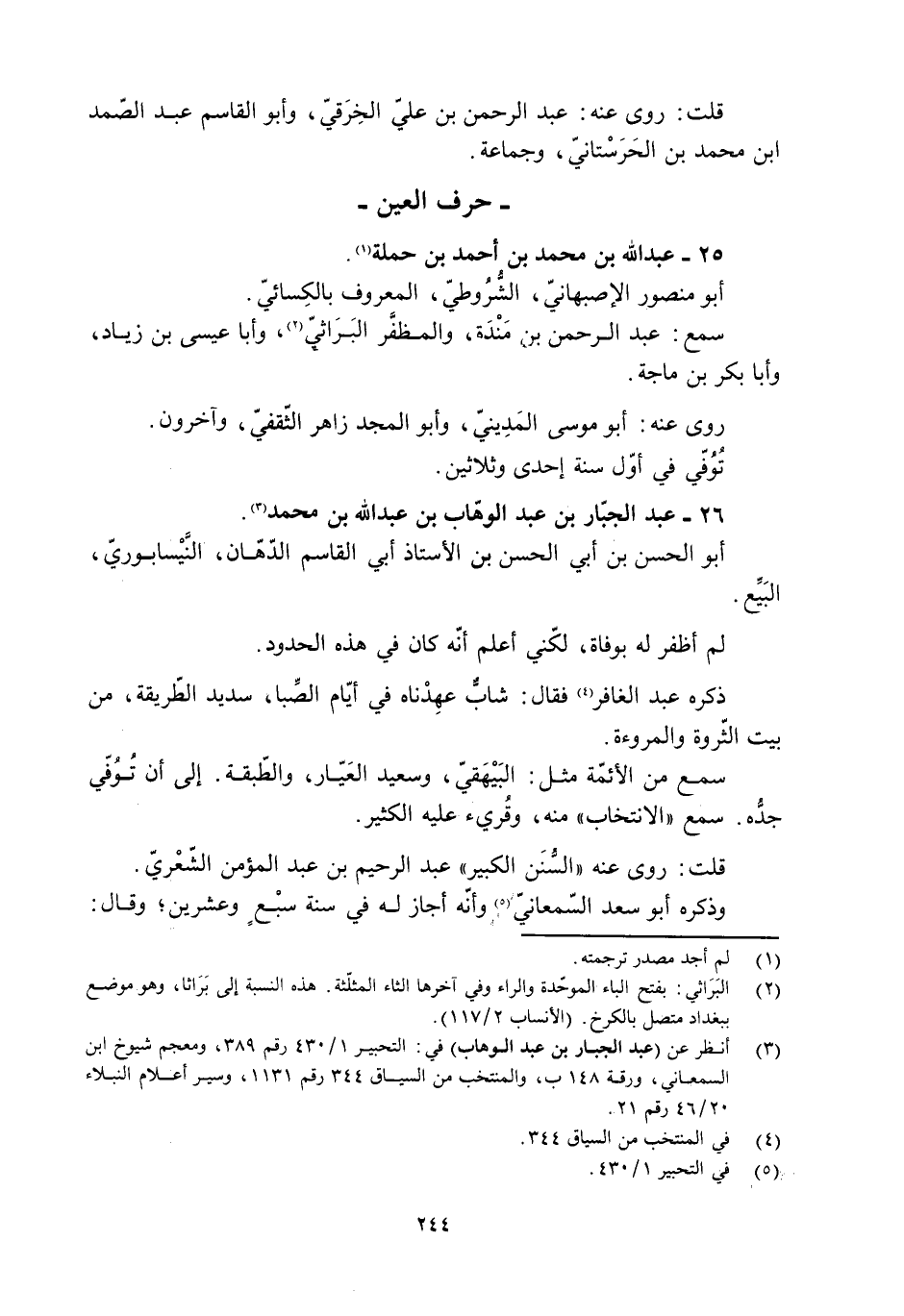 [3] انظر عن (عبد الجبار بن عبد الوهاب) في: التحبير 1/ 430 رقم 389، ومعجم شيوخ ابن السمعاني، ورقة 148 ب، والمنتخب من السياق 344 رقم 1131، وسير أعلام النبلاء 20/ 46 رقم 21.