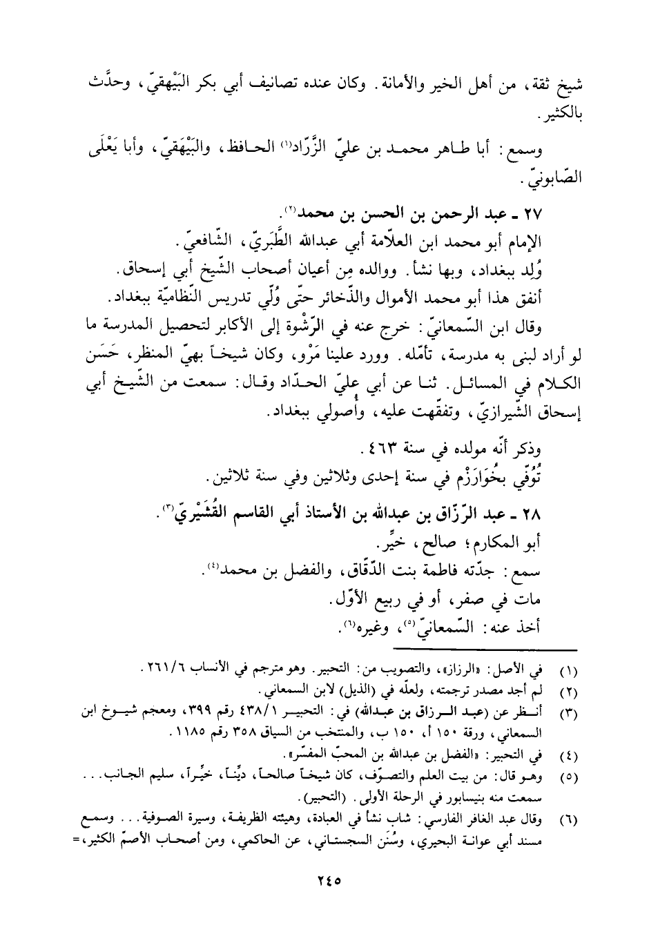 [3] انظر عن (عبد الرزاق بن عبد الله) في: التحبير 1/ 438 رقم 399، ومعجم شيوخ ابن السمعاني، ورقة 150 أ، 150 ب، والمنتخب من السياق 358 رقم 1185.