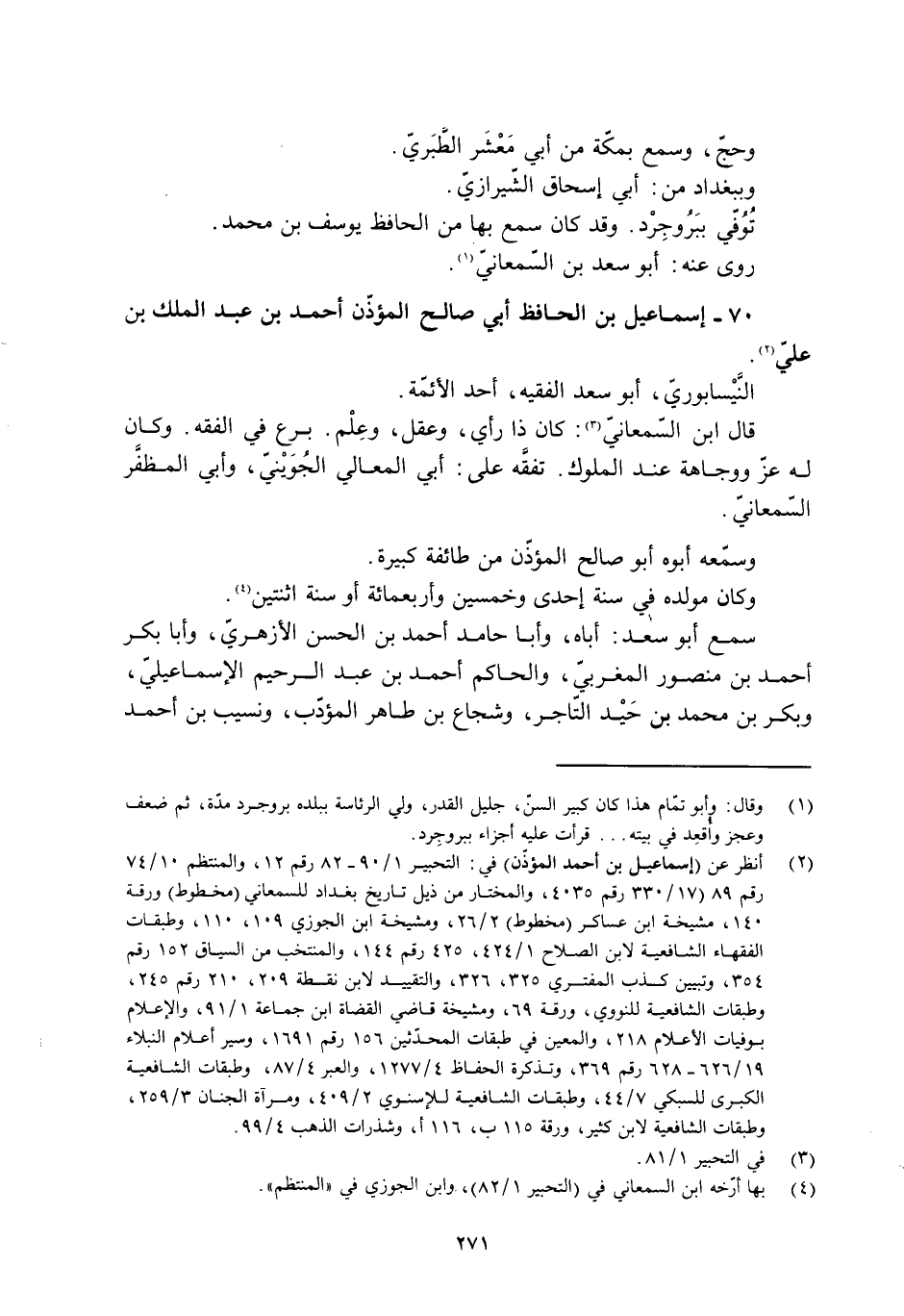 [2] انظر عن (إسماعيل بن أحمد المؤذّن) في: التحبير 1/ 90- 82 رقم 12، والمنتظم 10/ 74 رقم 89 (17/ 330 رقم 4035، والمختار من ذيل تاريخ بغداد للسمعاني (مخطوط) ورقة 140، مشيخة ابن عساكر (مخطوط) 2/ 26، ومشيخة ابن الجوزي 109، 110، وطبقات الفقهاء الشافعية لابن الصلاح 1/ 424، 425 رقم 144، والمنتخب من السياق 152 رقم 354، وتبيين كذب المفتري 325، 326، والتقييد لابن نقطة 209، 210 رقم 245، وطبقات الشافعية للنووي، ورقة 69، ومشيخة قاضي القضاة ابن جماعة 1/ 91، والإعلام بوفيات الأعلام 218، والمعين في طبقات المحدّثين 156 رقم 1691، وسير أعلام النبلاء 19/ 626- 628 رقم 369، وتذكرة الحفاظ 4/ 1277، والعبر 4/ 87، وطبقات الشافعية الكبرى للسبكي 7/ 44، وطبقات الشافعية للإسنويّ 2/ 409، ومرآة الجنان 3/ 259، وطبقات الشافعية لابن كثير، ورقة 115 ب، 116 أ، وشذرات الذهب 4/ 99.