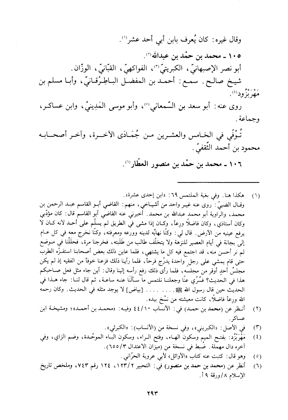 [6] انظر عن (محمد بن حمد بن منصور) في: التحبير 2/ 123، 124 رقم 743، وملخص تاريخ الإسلام 8/ ورقة 9 أ.