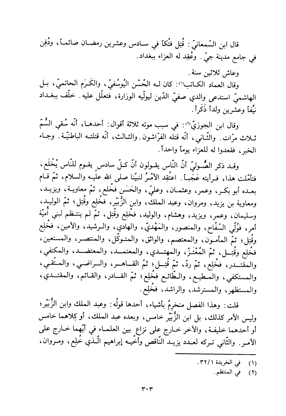 وقد ذكر الصُّوليّ أنّ النّاس يقولون أنّ كلّ سادس يقوم للنّاس يُخْلَع، فتأملت هذا، فرأيته عَجَبًا. اعتُقِد الأمر لنبيّنا صَلَّى اللَّهُ عَلَيْهِ والسلام، ثمّ قام بعده أبو بكر، وعمر، وعثمان، وعليّ، والحسن فخُلع، ثمّ معاوية، ويزيد، ومعاوية بن يزيد، ومروان، وعبد الملك، وابن الزُّبير، فخلع وقتل، ثمّ الوليد، وسليمان، وعمر، ويزيد، وهشام، والوليد، فخُلع وَقُتِلَ، ثمّ لم ينتظم لبني أُميَّة أمر، فوُلّي السّفّاح، والمنصور، والمَهْديّ، والهادي، والرشيد، والأمين، فخُلِع وَقُتِلَ، ثمّ المأمون، والمعتصم، والواثق، والمتوكل، والمنتصر، والمستعين، فخُلِع وَقُتِلَ، ثمّ المُعتز، والمهتدي، والمعتمد، والمعتضد، والمكتفي، والمقتدر، فخُلِع، ثمّ ردّ، ثمّ قتل، ثمّ القاهر، والراضي، والمتّقي، والمستكفي، والمطيع، والطائع فخُلِع، ثمّ القادر، والقائم، والمقتدي، والمستظهر، والمسترشد، والراشد، فخُلِع.