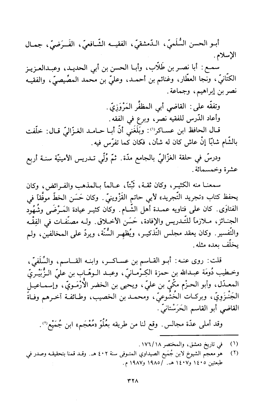[2] هو معجم الشيوخ لابن جميع الصيداوي المتوفى سنة 402 هـ. وقد قمنا بتحقيقه وصدر في طبعتين 1405 و 1407 هـ. / 1985 و 1987 م.