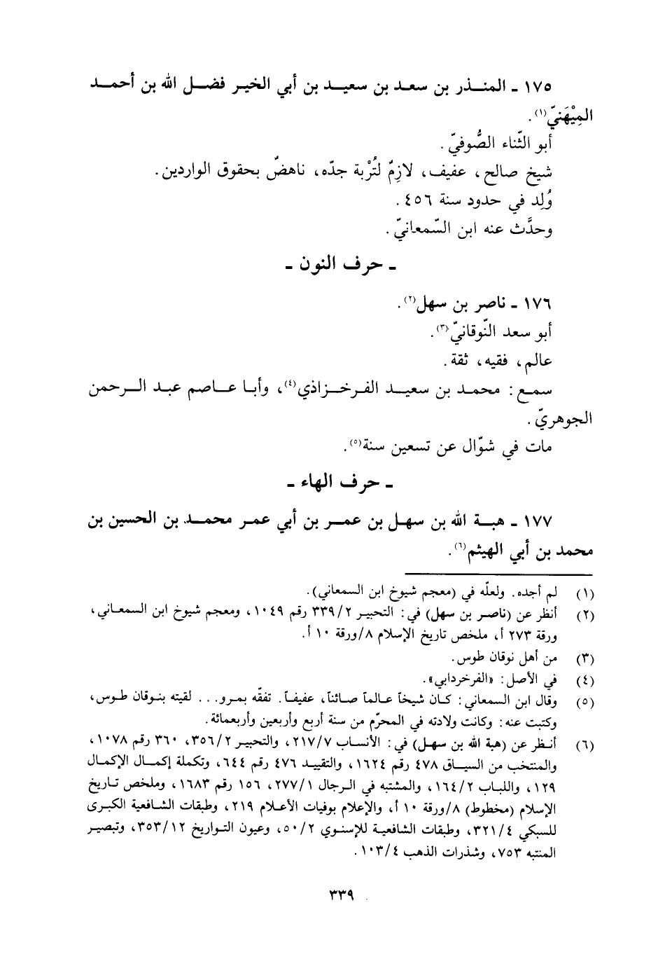 [2] انظر عن (ناصر بن سهل) في: التحبير 2/ 339 رقم 1049، ومعجم شيوخ ابن السمعاني، ورقة 273 أ، ملخص تاريخ الإسلام 8/ ورقة 10 أ.