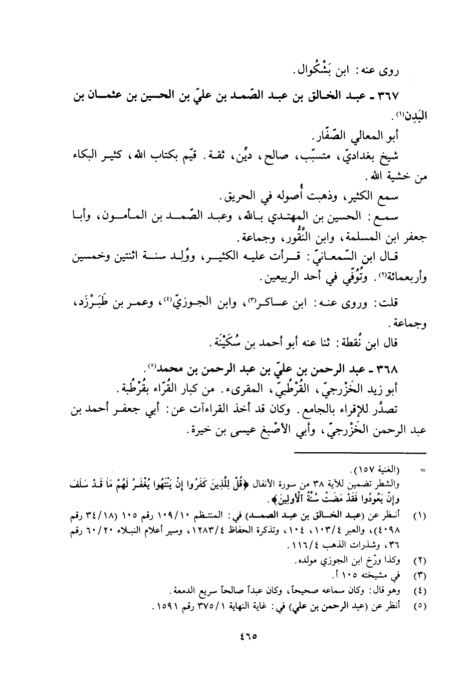 367- عبد الخالق بن عبد الصمد بن علي بن الحسين بن عثمان بن البَدِن [1] .
