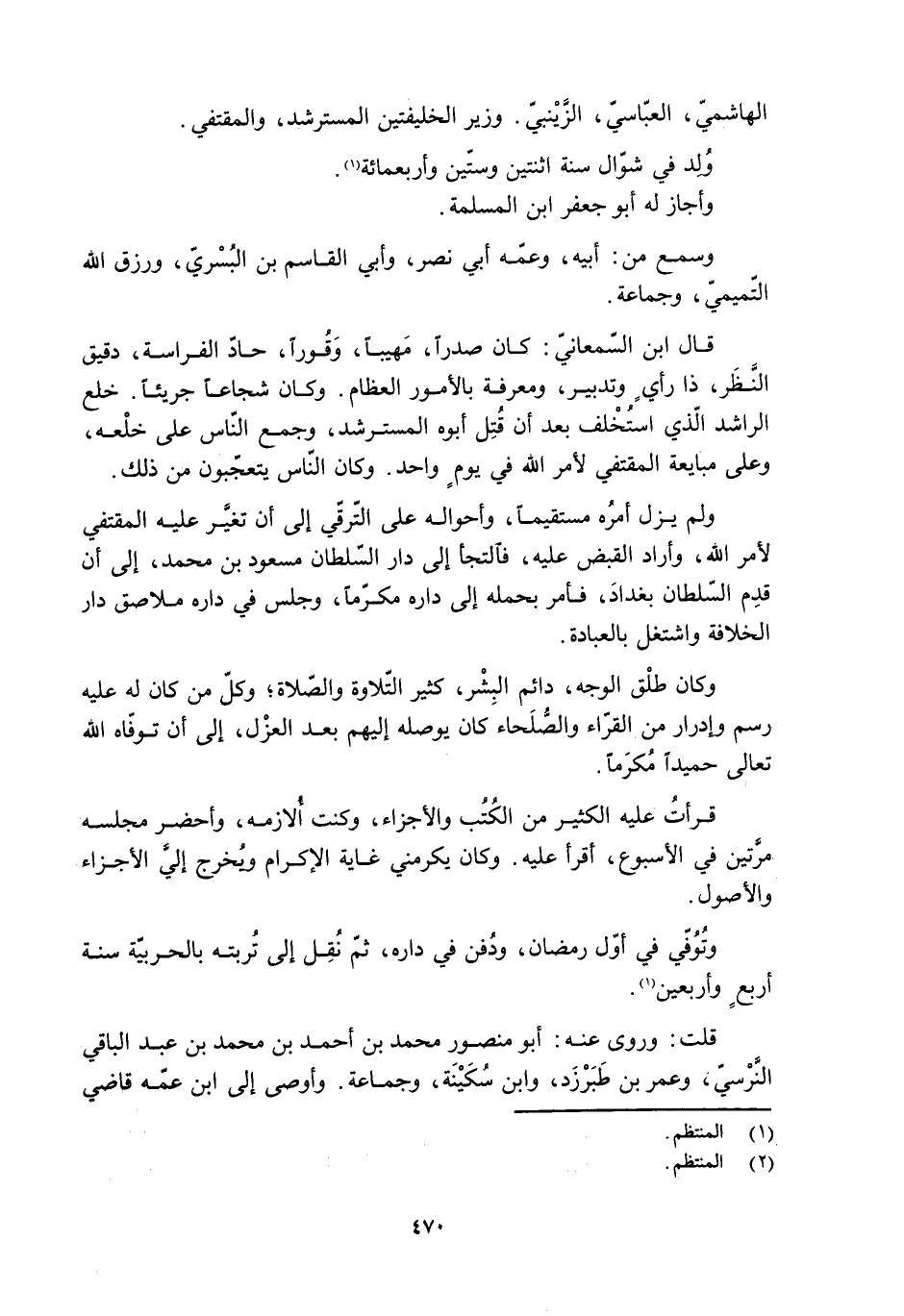قال ابن السَّمْعانيّ: كان صدرًا، مهيبًا، وقورًا، حادّ الفراسة، دقيق النَّظَر، ذا رأيٍ وتدبير، ومعرفة بالأمور العظام. وكان شجاعًا جريئًا. خلع الراشد الّذي استُخْلف بعد أن قُتِلَ أبوه المسترشد، وجمع النّاس على خلْعه، وعلى مبايعة المقتفيّ لأمر الله في يوم واحد. وكان النّاس يتعجّبون من ذلك.