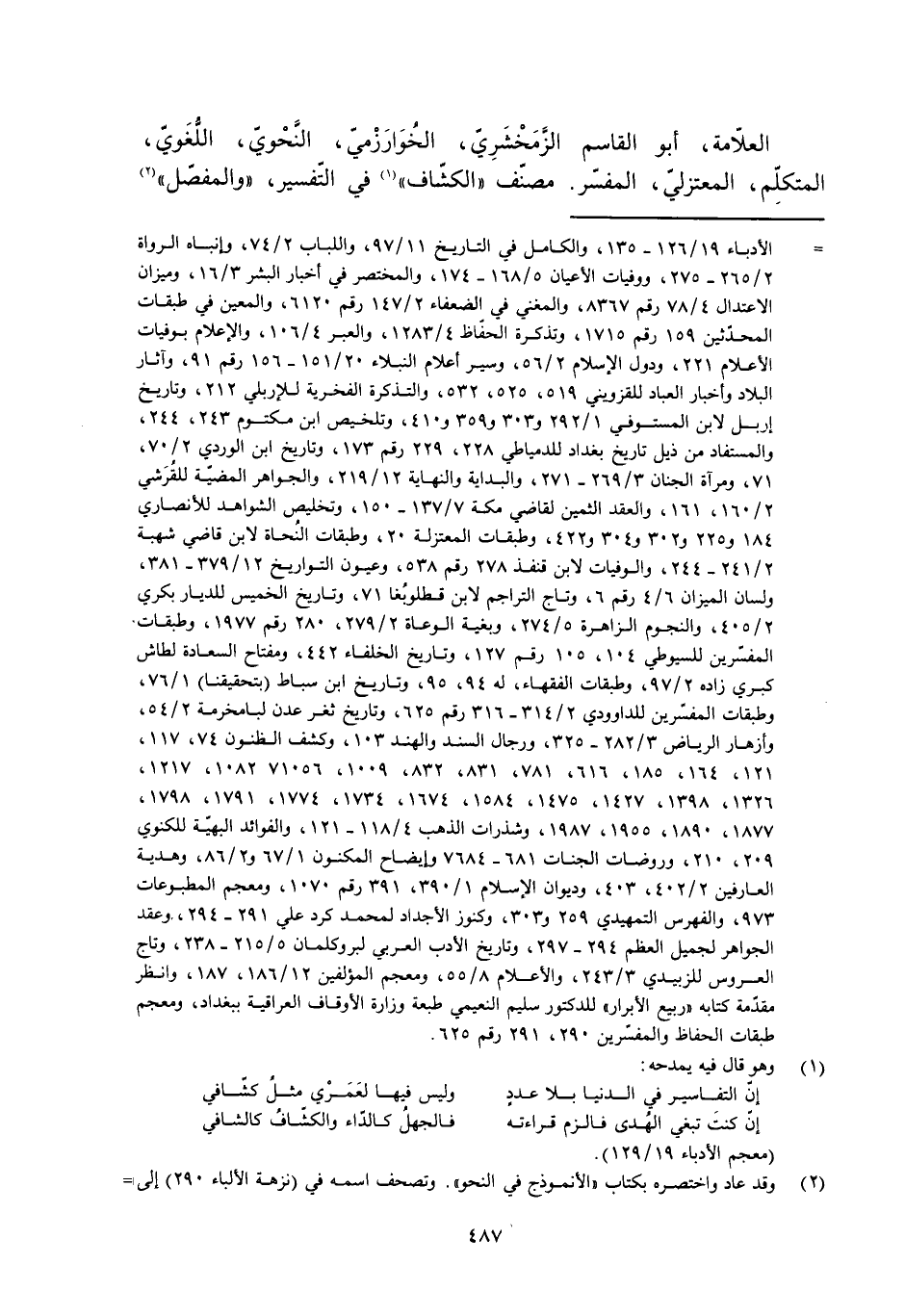 العلّامة، أبو القاسم الزَّمَخْشَرِيّ، الخُوَارَزْميّ، النَّحْويّ، اللُّغَويّ، المتكلم، المعتزليّ، المفسر. مصنّف «الكشّاف» [1] في التّفسير، «والمفصّل» [2]
