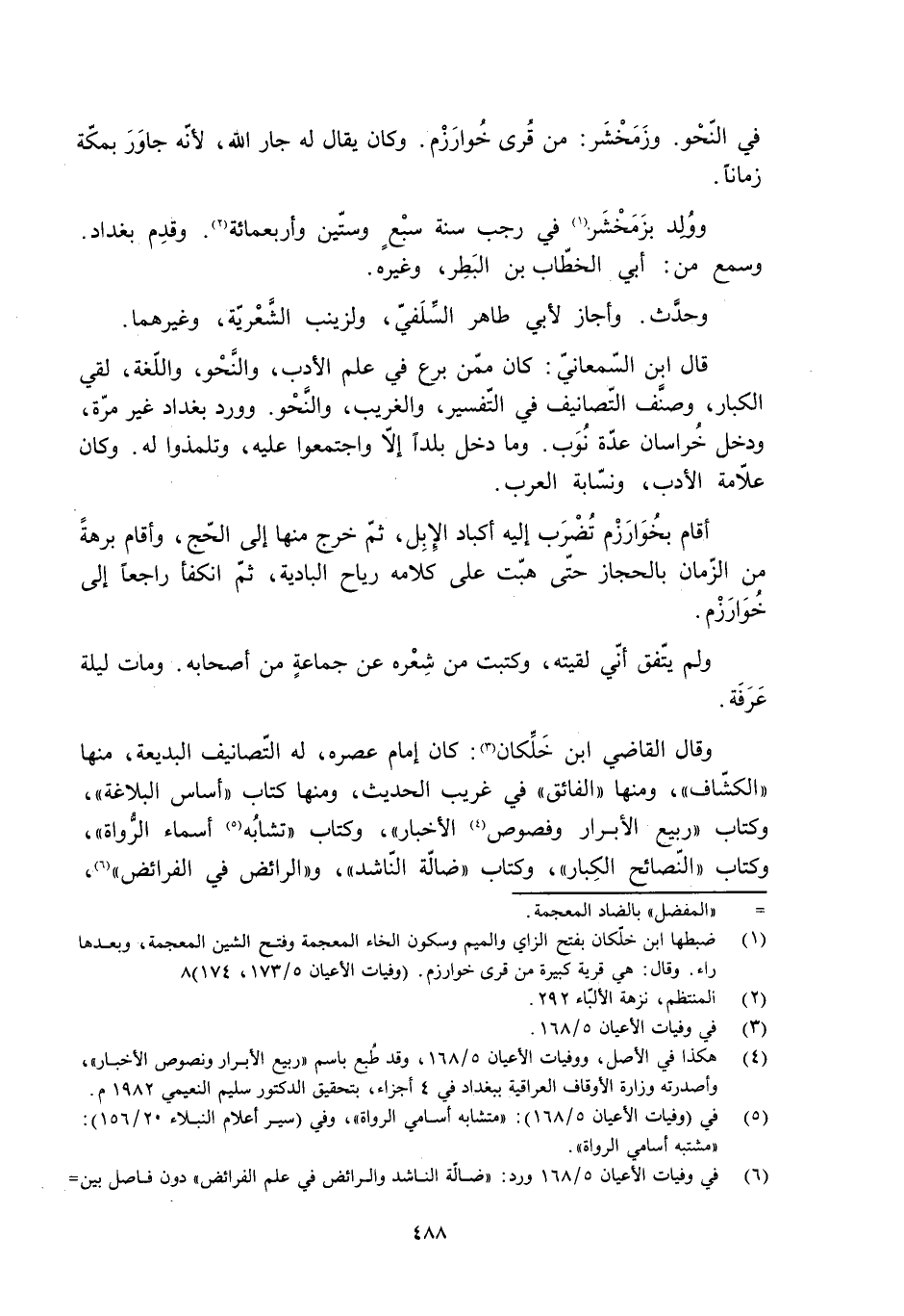 وقال القاضي ابن خَلِّكان [3] : كان إمام عصره، له التّصانيف البديعة، منها «الكشّاف» ، ومنها «الفائق» في غريب الحديث، ومنها كتاب «أساس البلاغة» ، وكتاب «ربيع الأبرار وفصوص [4] الأخبار» ، وكتاب «تشابُه [5] أسماء الرُّواة» ، وكتاب «النّصائح الكبار» ، وكتاب «ضالّة النّاشد» ، و «الرائض في الفرائض» [6] ،